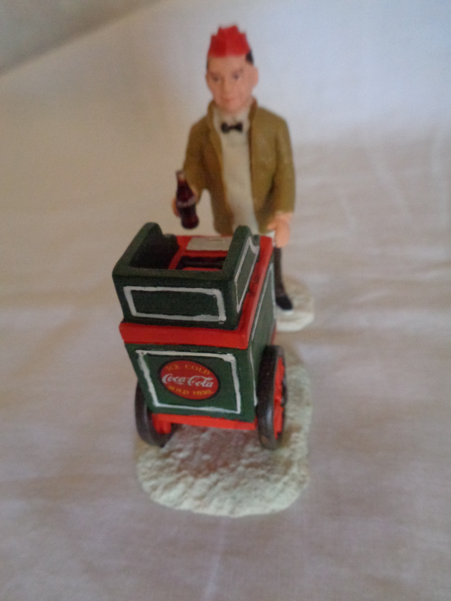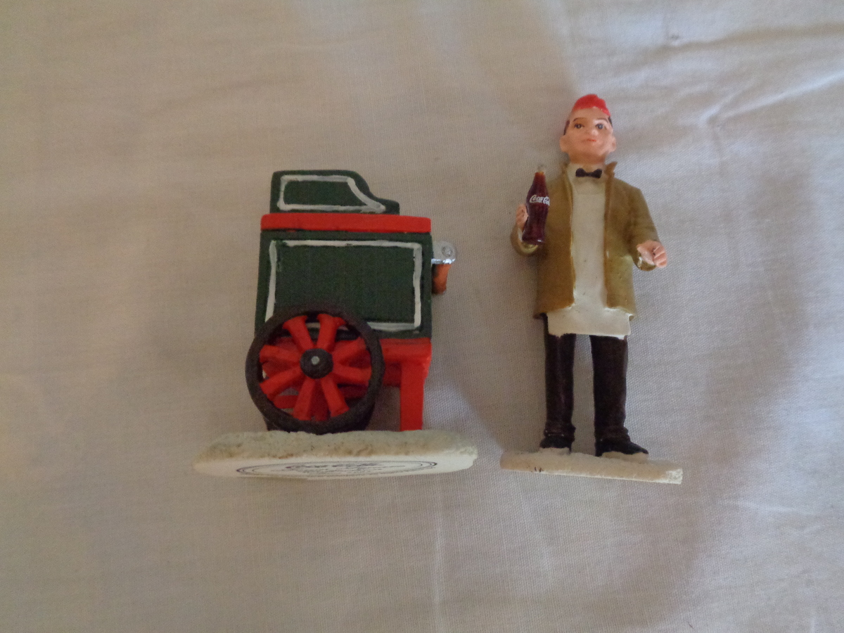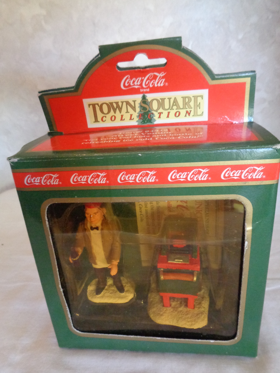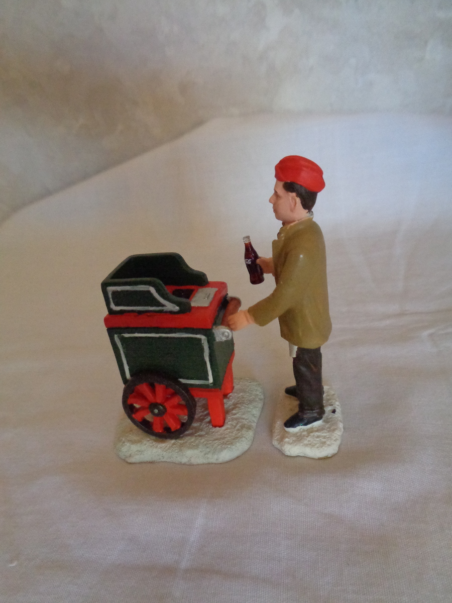 Street Vendor #64312 UPC:715429643126 Coca-Cola 1992, (#6417) Town Square Collection. “Get your red hots and bottle pf refreshing ice cold “Coca-Cola! “The street vendor peddles his cart around the square selling bottles of ice cold Coca-Cola and hot dogs to the townspeople while they take a break from their daily activities. It was made in China. UPC: 715429643126. It is in excellent condition. Please see pix for a complete description.