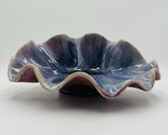 Add a touch of Mid-Century Modern charm to any room with this rare studio art pottery candle holder. Handmade in the United States in the 1980s, this original piece features a glossy finish and a beautiful shell pattern in shades of purple and pink. Measuring 11 inches in length and 5 inches in height, it's suitable for any size pillow candle.