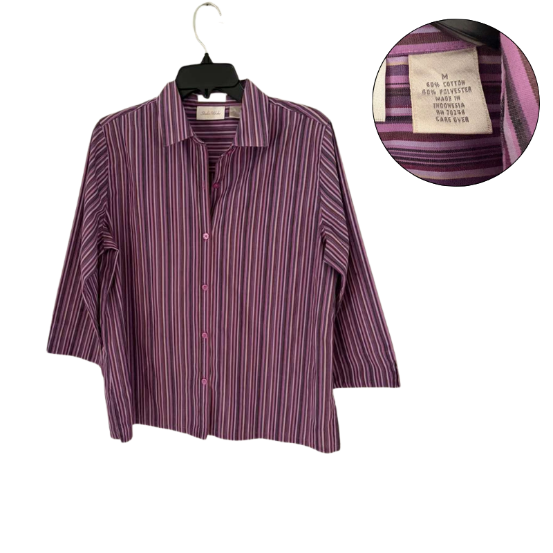 This stylish Basic Editions women's button-up shirt features a purple and pink striped pattern with a classic collar and 3/4 sleeves. Made from a comfortable blend of 60% cotton and 40% polyester, it?s both soft and easy to care for.