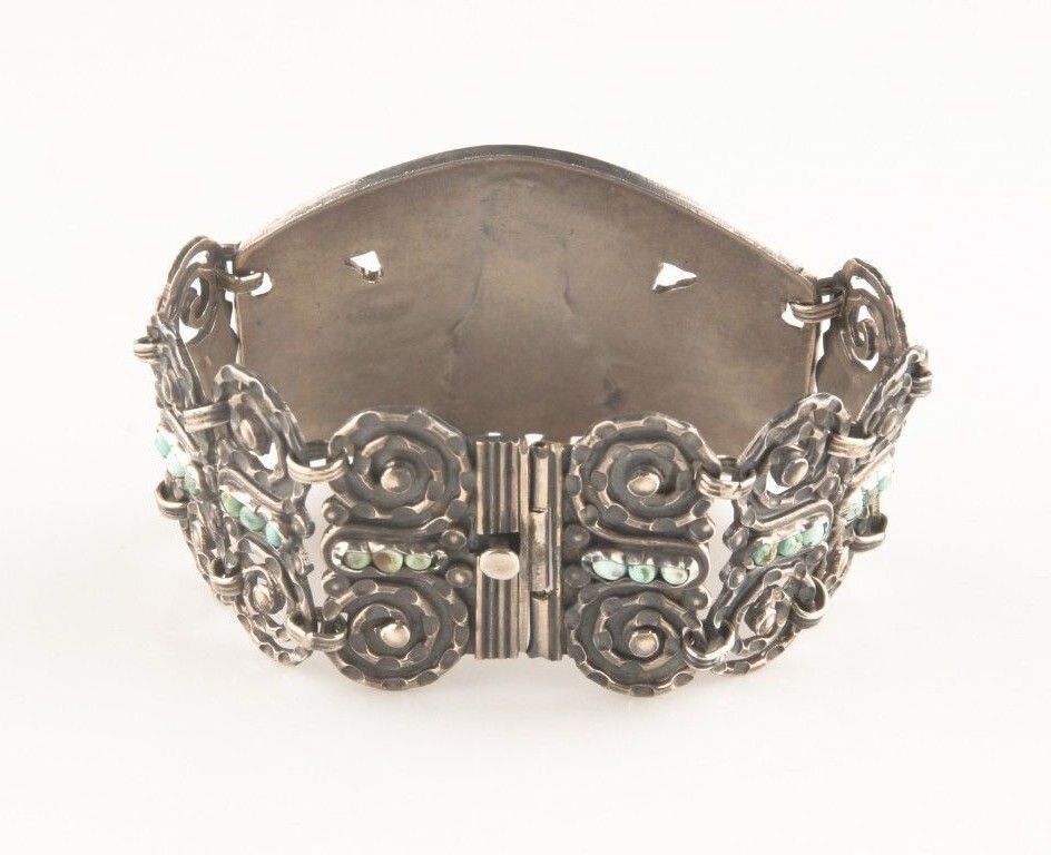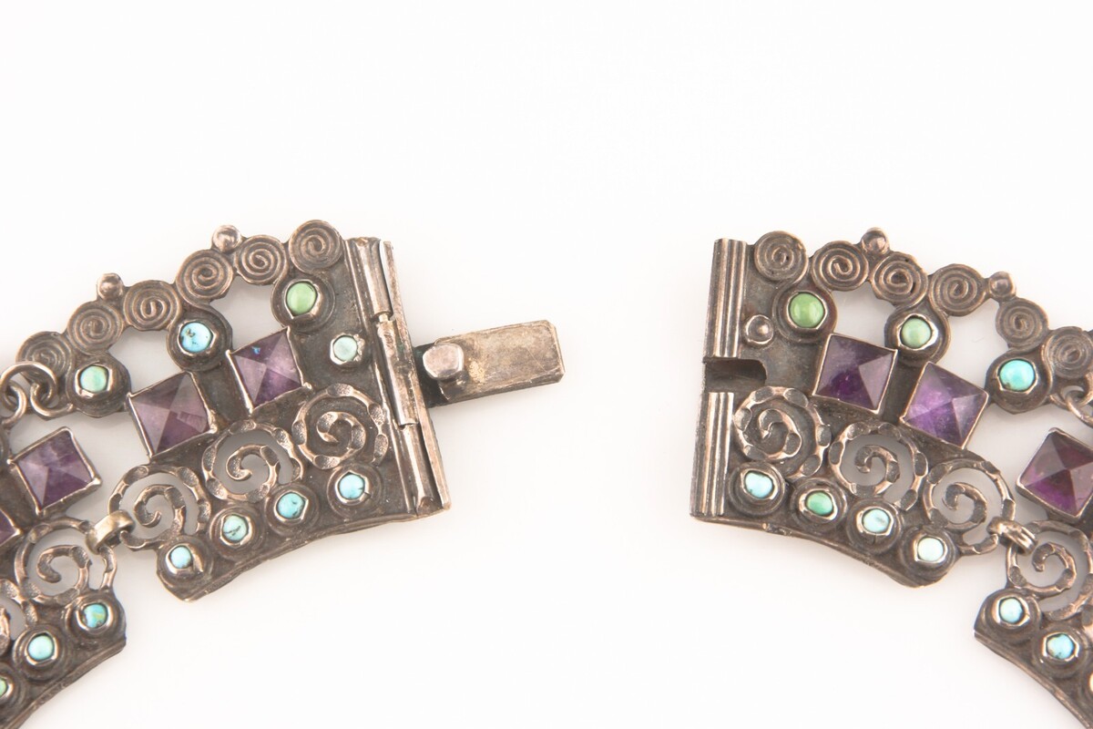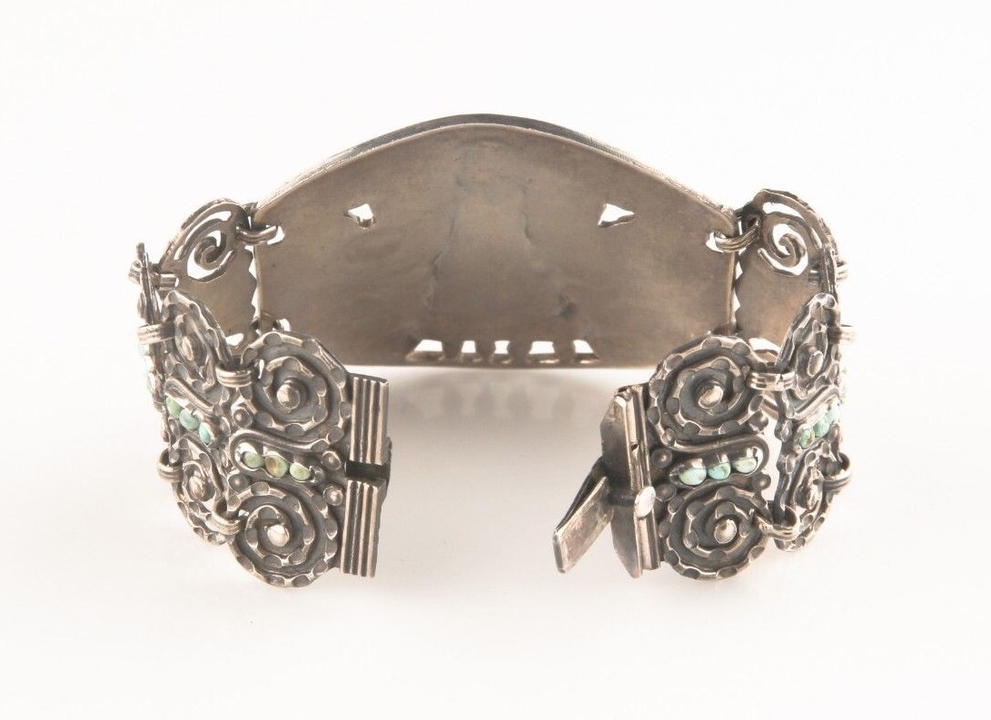 This beautiful handcrafted intricately detailed jewelry set is decorated with amethyst and turquoise. The bracelet is adorned with two repousse palomas (doves) with coral eyes. These pieces are from Mexico City and are in excellent vintage condition!