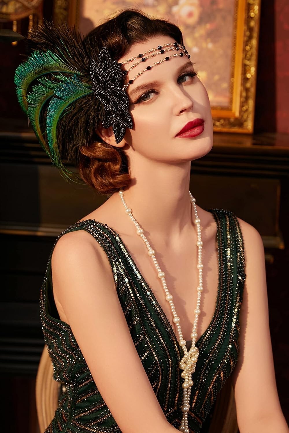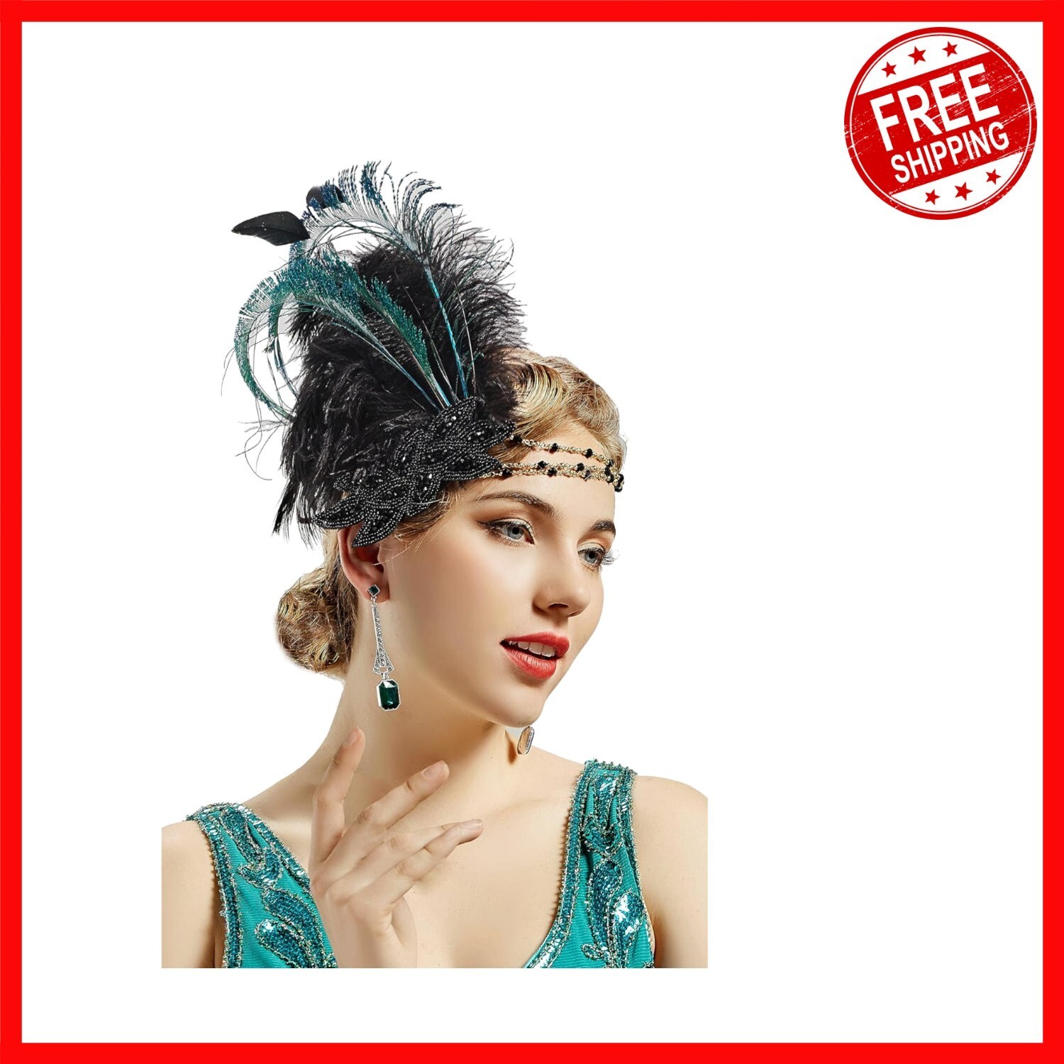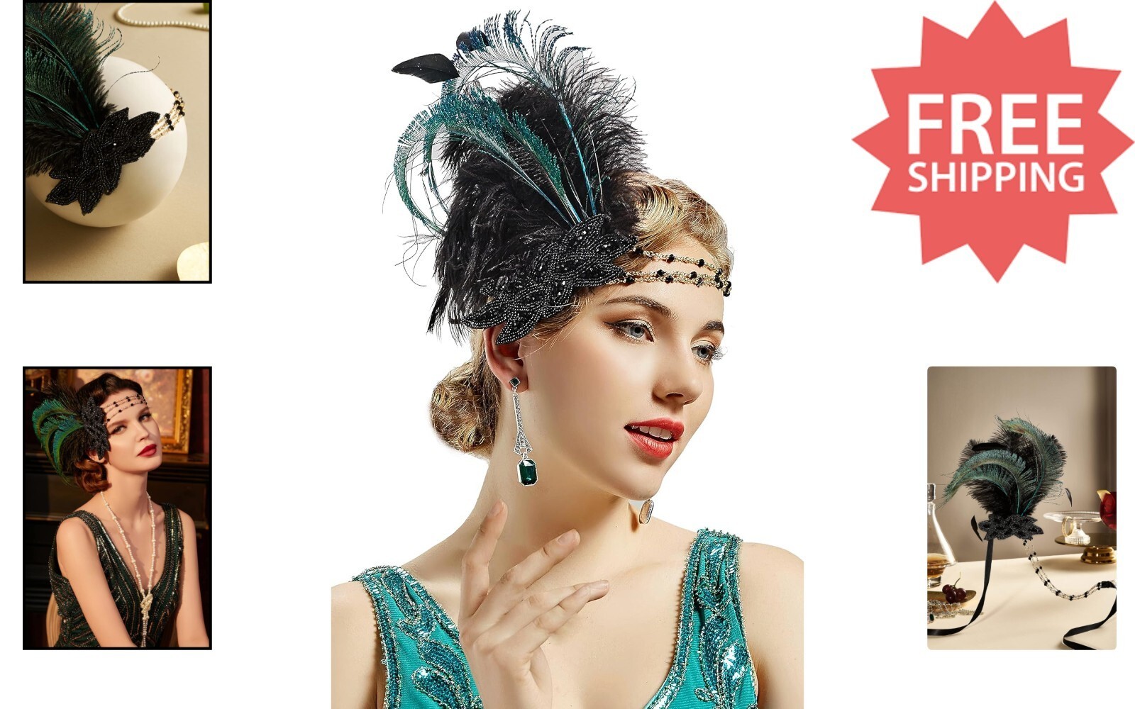 Elevate your style with this exquisite flapper headpiece, crafted from luxurious feathers, sparkling crystal rhinestones, beads, and imitation pearls. Featuring a versatile adjustable ribbon band, one size fits most comfortably. The opulent peacock feathers evoke a regal elegance, while the dazzling rhinestones add a shimmering touch of glamour. Ideal for cocktail parties, proms, evening events, Christmas celebrations, Gatsby-themed parties, wedding receptions, cosplay, and more. A perfect gift for moms, sisters, girlfriends, or friends to celebrate the glamorous spirit of the 1920s. Make every occasion unforgettable with this stunning accessory.