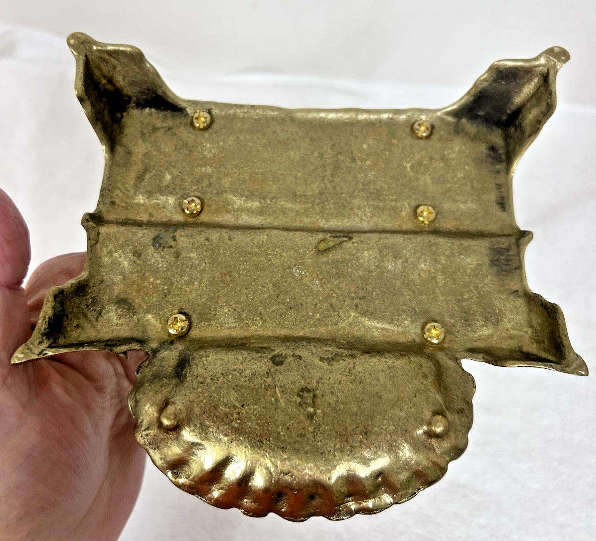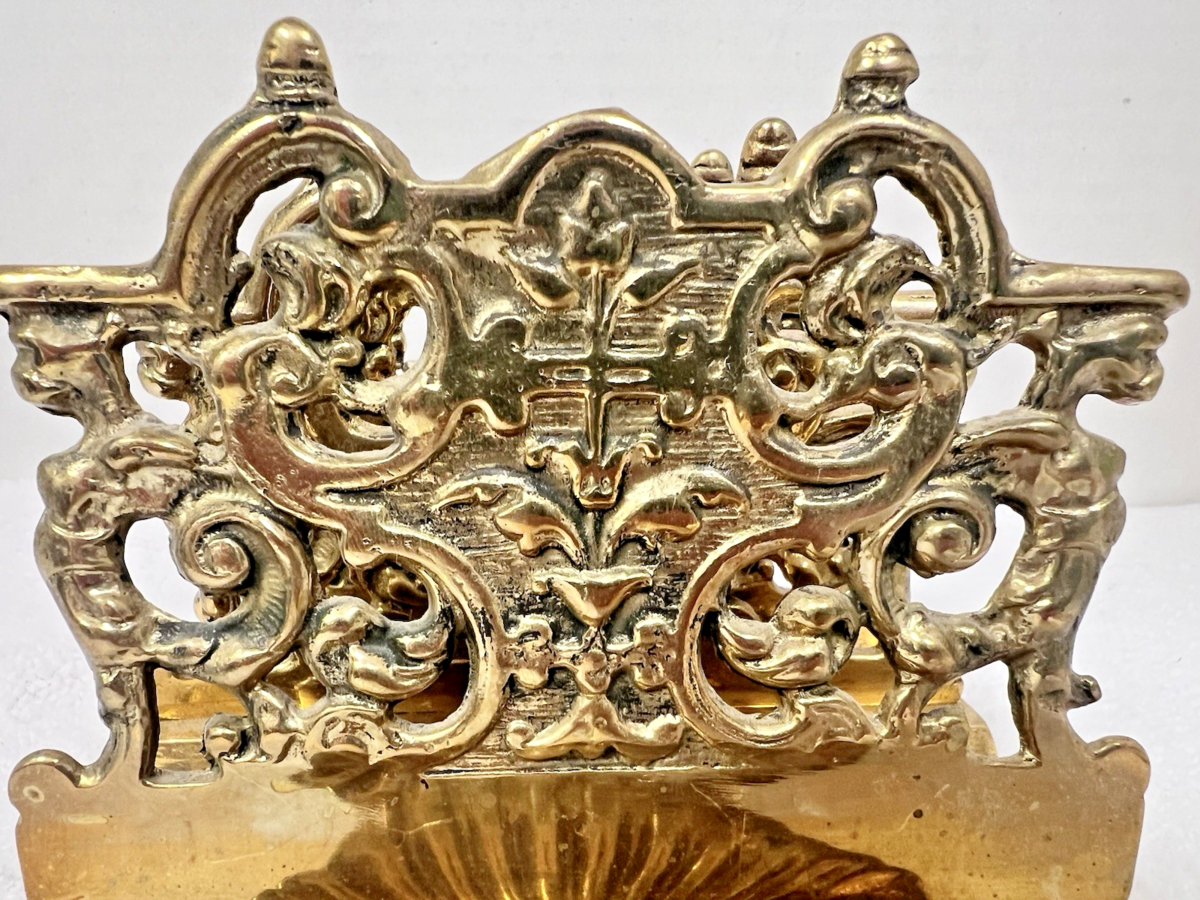 Stunning Solid Brass Letter Stand w Shell Clip Holder Floral Scroll Design 6 1/8th x 5 3/8 x 4 1/2 inches In great shape the weight is just over 2 pound several small dark marks we have not tried to remove