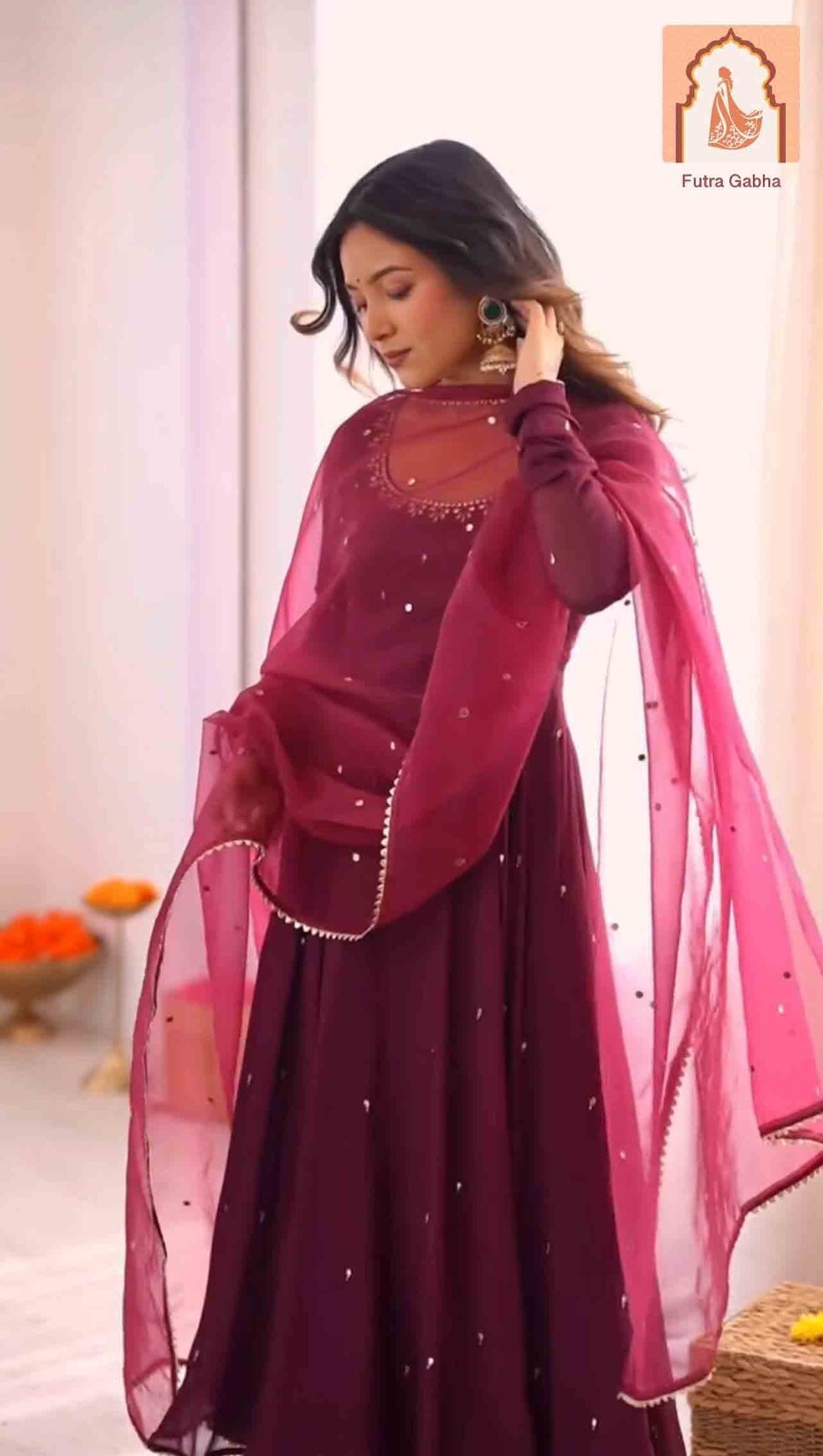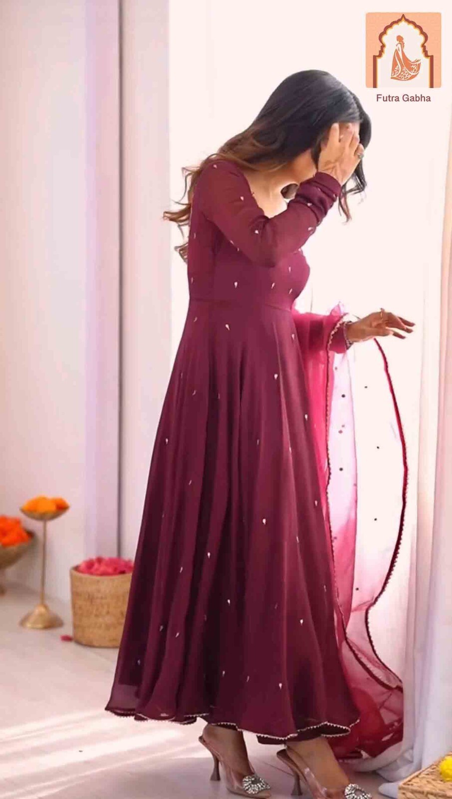 Elevate your ethnic wear collection with this exquisite gown set, perfect for special occasions and festivities. This beautifully crafted ensemble features intricate embroidery and sequence work on heavy georgette fabric, giving it a luxurious feel.