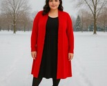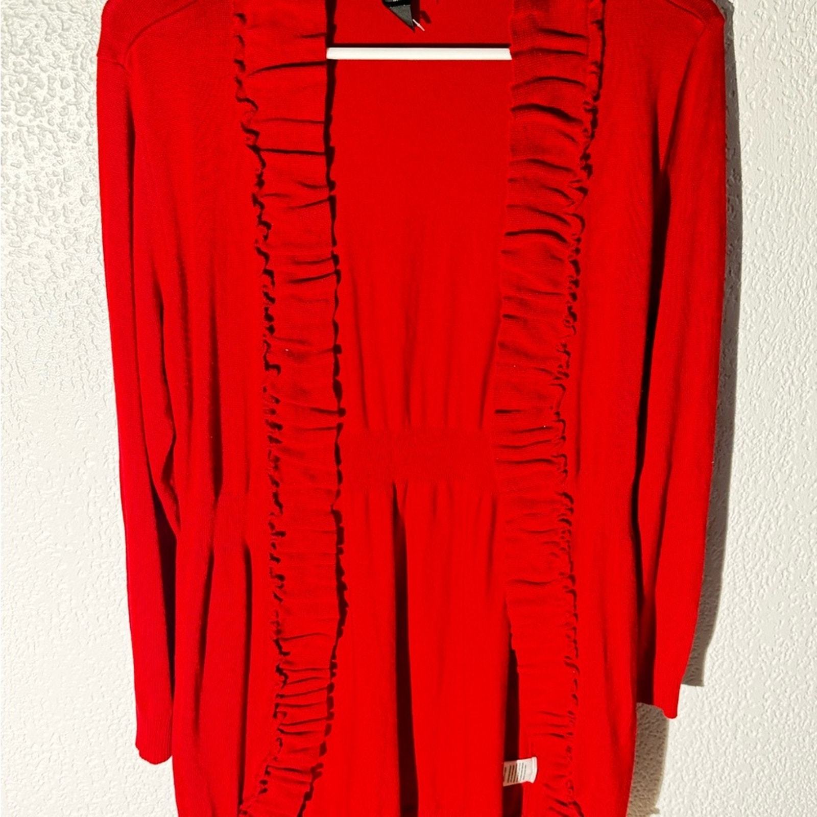 The sweater is a vibrant red, open-front cardigan with long sleeves and a mid-thigh length. It features a decorative ruffled trim that runs along the front opening from the neckline down to the hem, adding a touch of texture and femininity to the design. The fabric appears soft and slightly stretchy, ideal for layering in colder weather. It complements the black dress worn underneath and stands out beautifully against the snowy winter background.