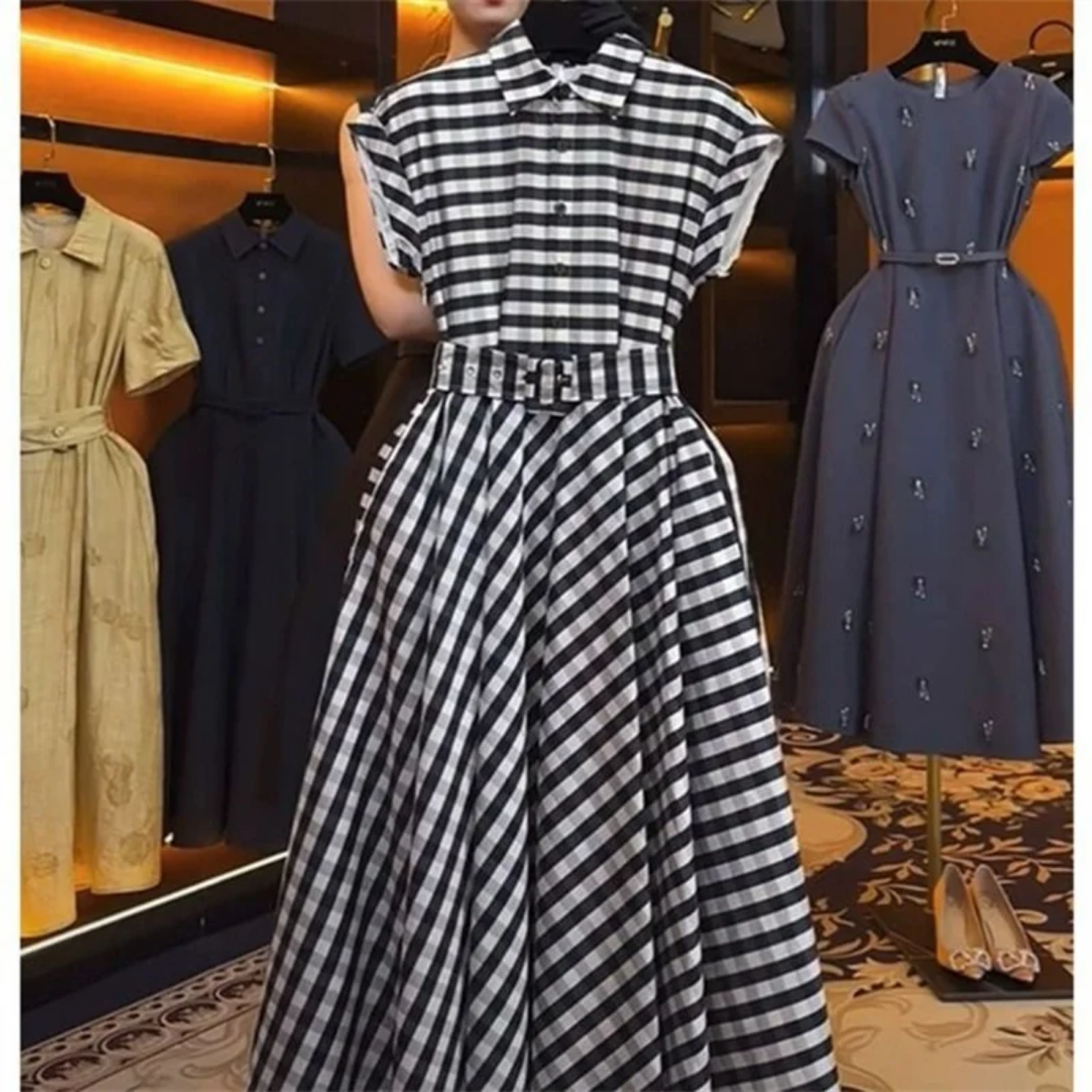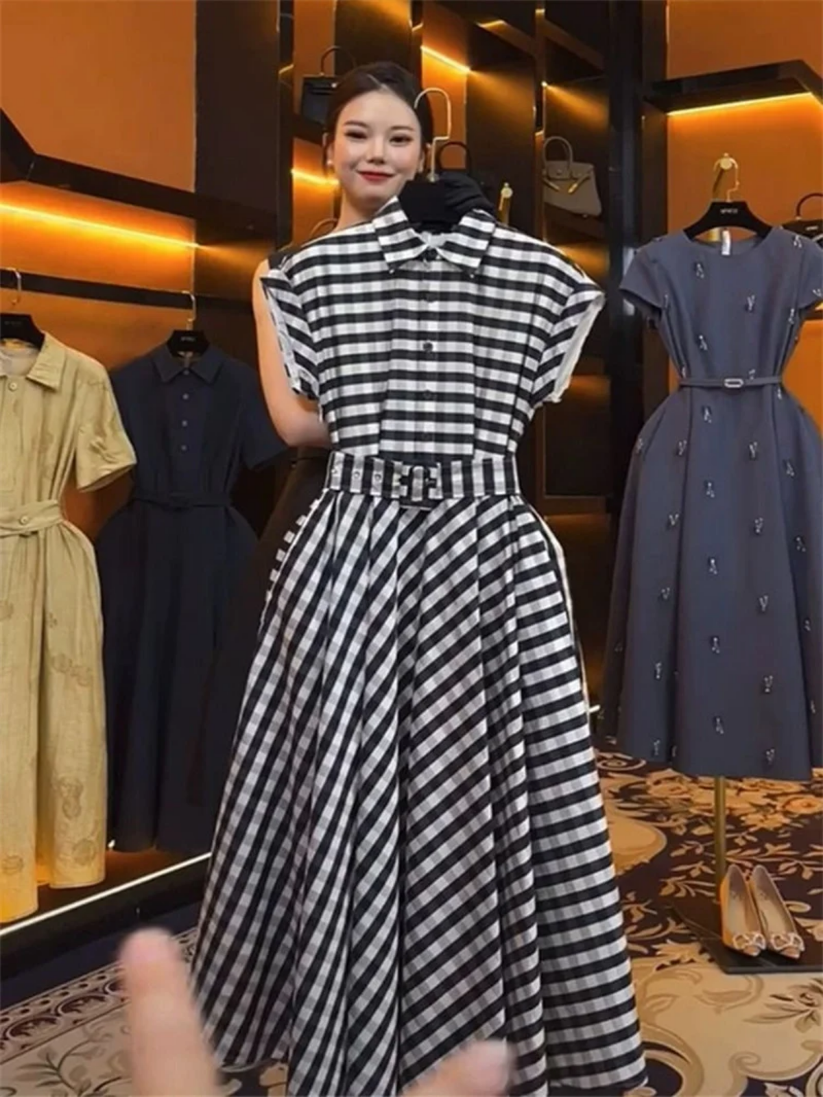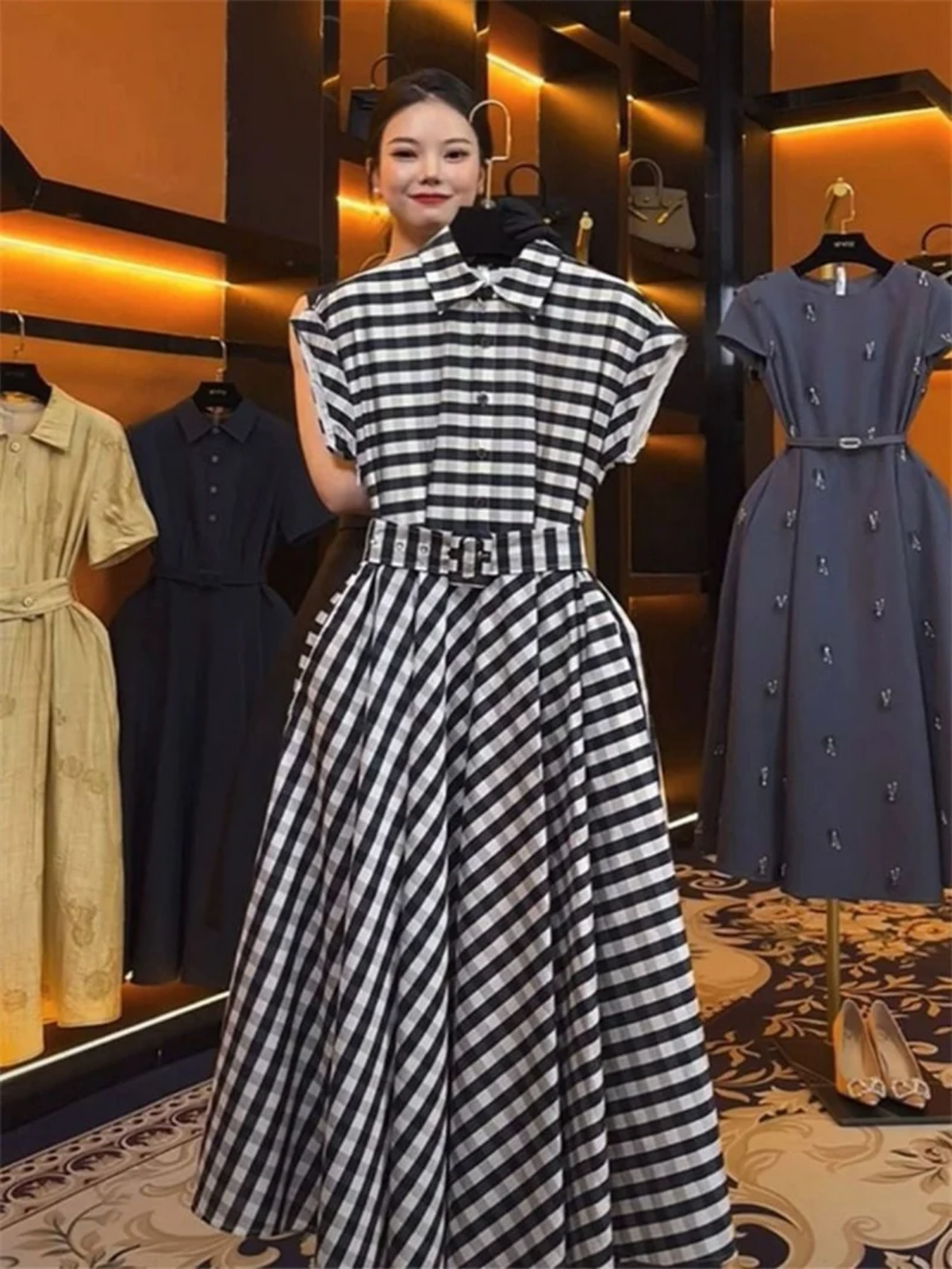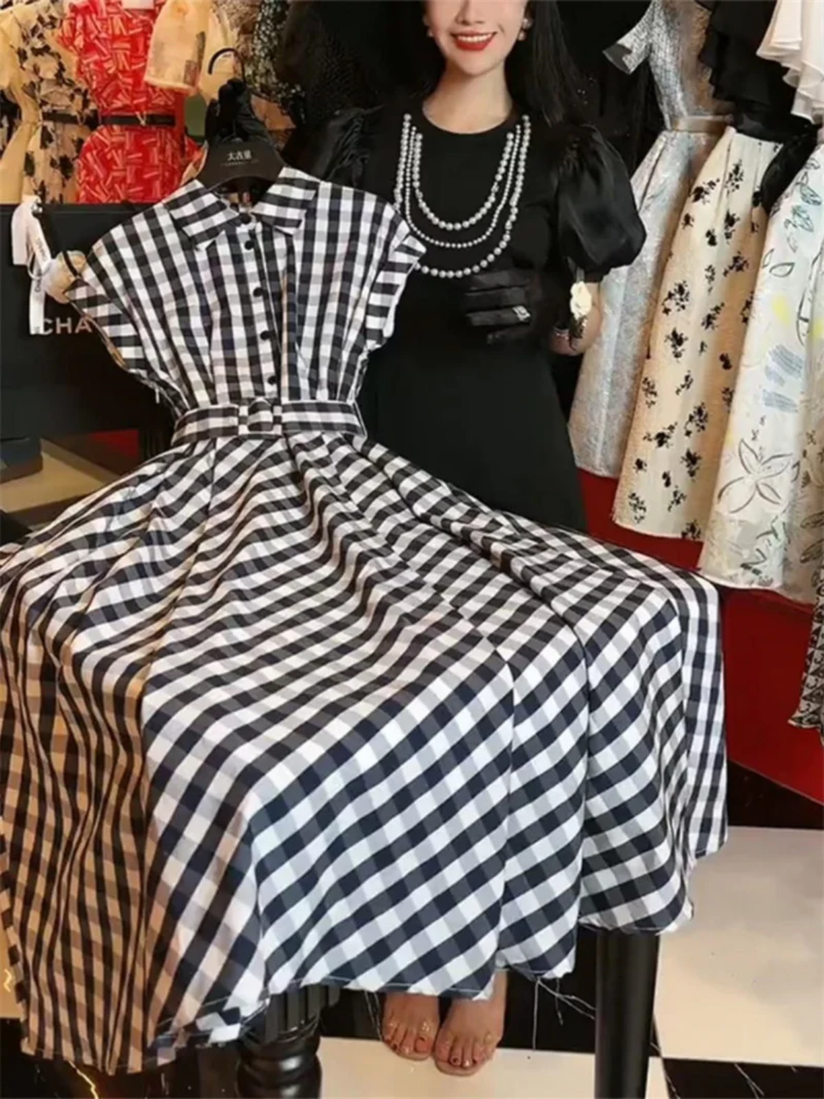 Summer French Elegant Polo Collar High Waist Slim Plaid A-Line Dress