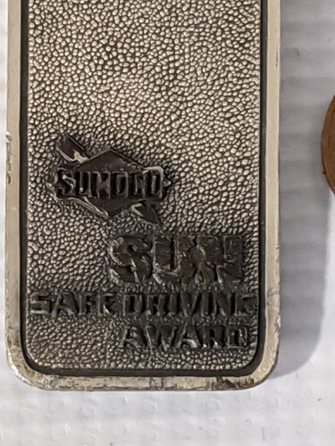 A vendre est un usage terni Sunoco Sun Oil Safe Driving Award Support a pince a billets en argent sterling 925. Le clip mesure 2" x 1" et pese 1,7 oz.
