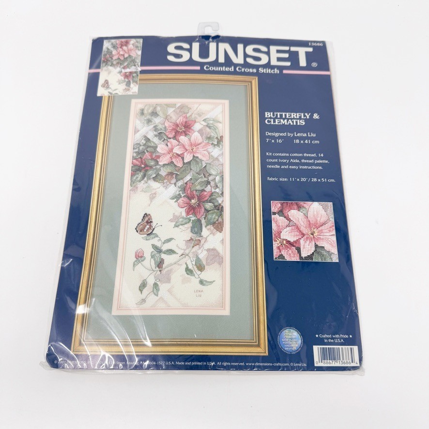 - Sunset 2001 BUTTERFLY & CLEMATIS Counted Cross Stitch Kit 7x16 #13686 NEW