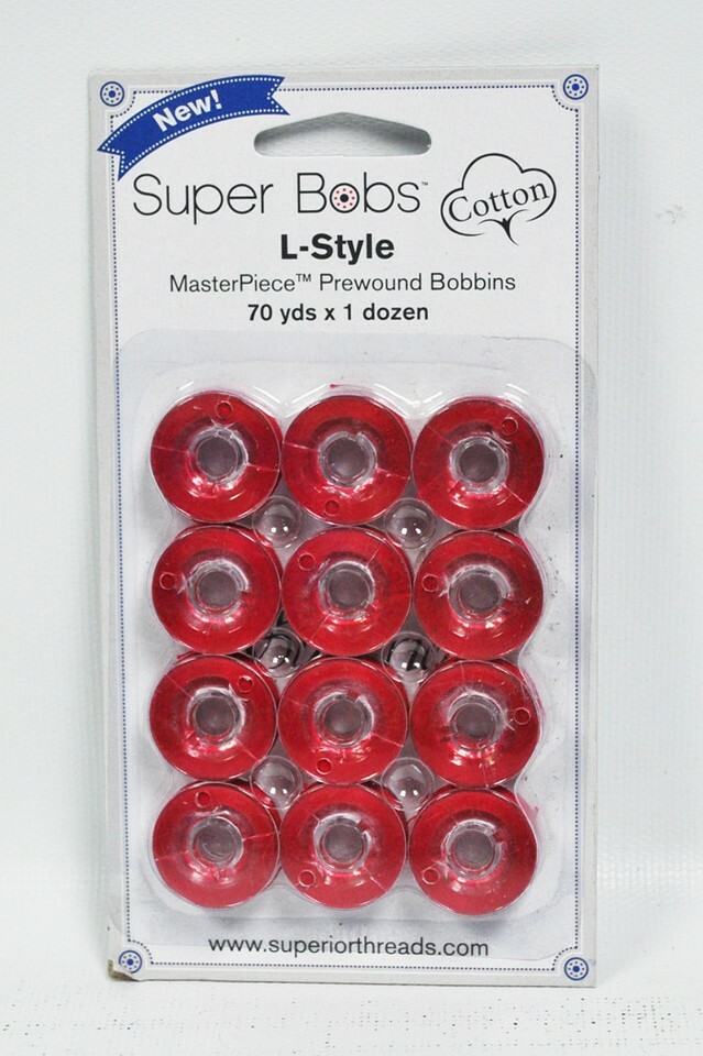 L Style Bobbins #118 Renae Red. Super Bobs are prewound bobbins that are wound with MasterPiece Egyptian-grown extra-long staple cotton thread. MasterPiece bobbins create precise stitches, have very little lint, and lasts longer due to precision winding. These bobbins hold 30-60% more than a self-wound bobbin. 12 Bobbins in package. L-Style Prewound Bobbins 70 yds x 1 dozen. Wound with MasterPiece 50 wt. 2-ply Egyptian grown extra long staple cotton thread.