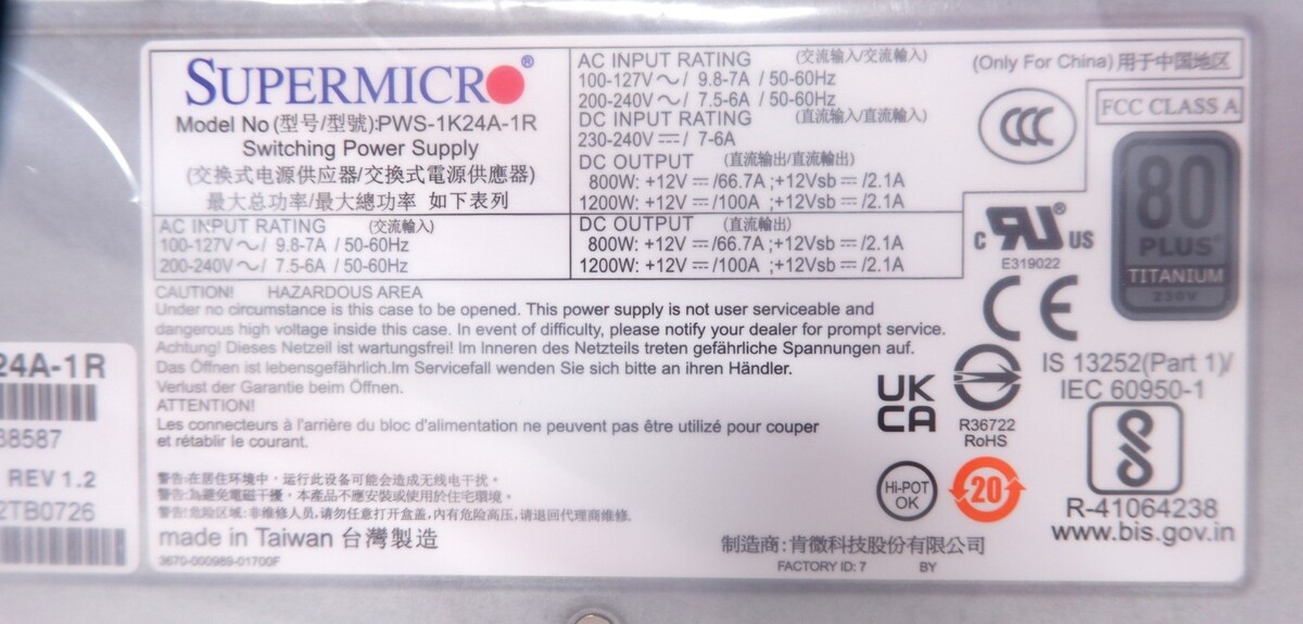 - SUPERMICRO PWS-1K24A-1R 800/1200W 80+ TITANIUM 100-240V 1U POWER SUPPLY PSU, NEW