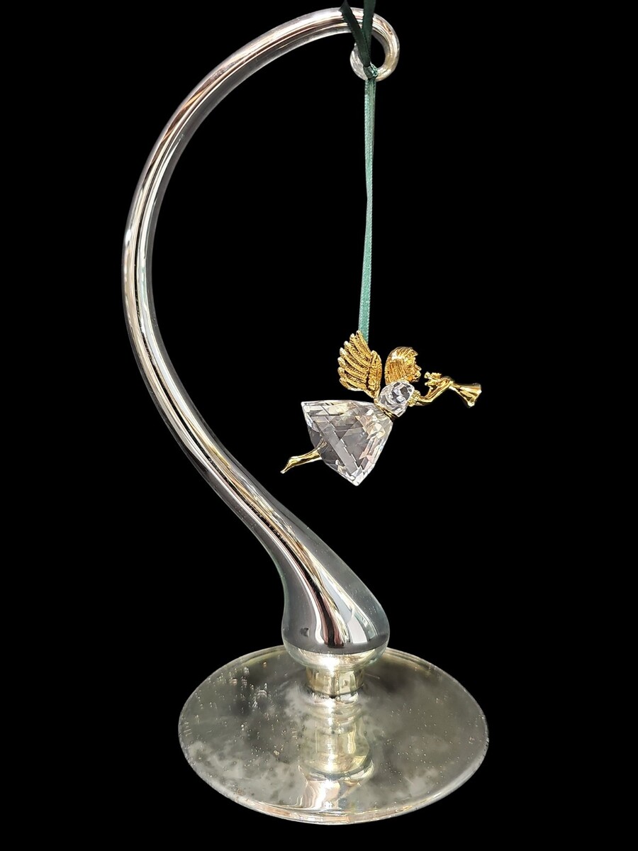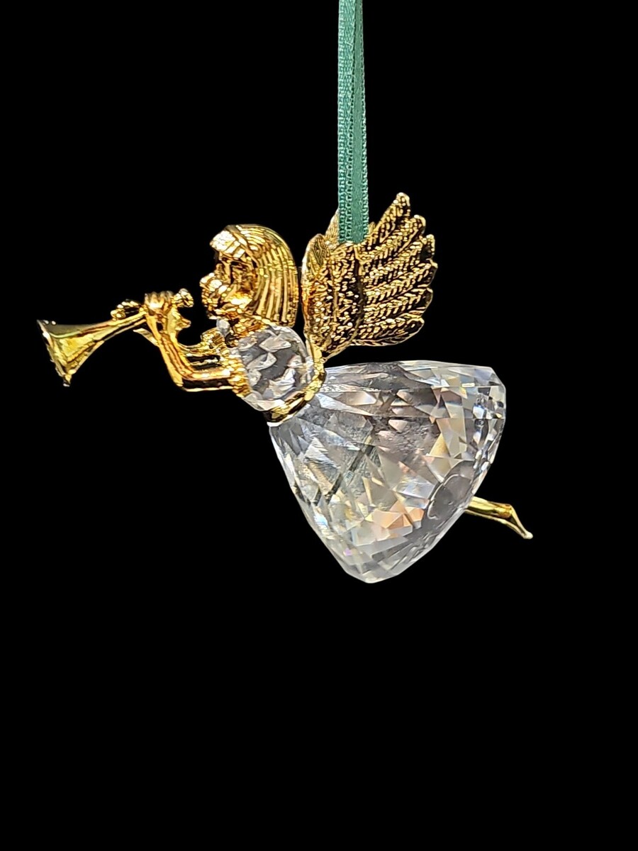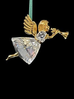 Expertly crafted in Austria, this ornament features a beautifully faceted clear crystal angel holding a delicate gold-tone metal trumpet. The details are exquisite ? from her shimmering wings to the precision-cut crystal folds of her gown. She is presented in the elegant white leatherette display case with green satin interior, accompanied by the outer illustrated box and Certificate of Authenticity / leaflet.