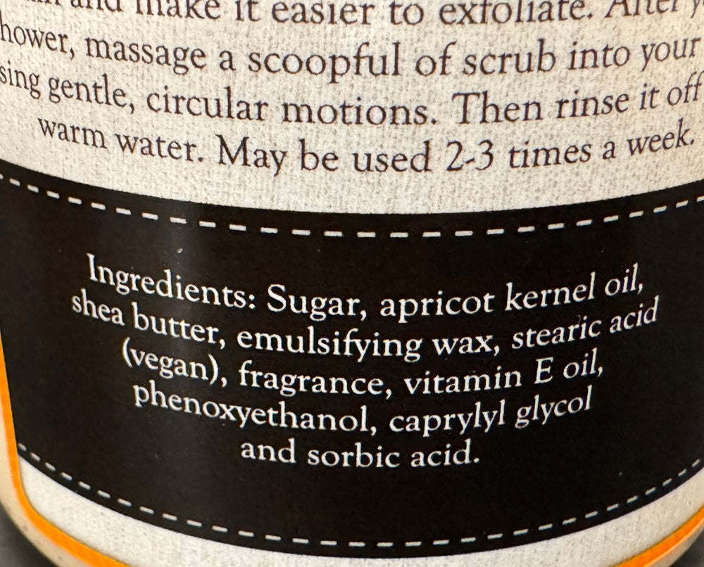 Ingredients: Sugar, apricot kernel oil, shea butter, emulsifying wax, stearic acid (vegan), fragrance, vitamin E oil, phenoxyethanol, caprylyl glycol and sorbic acid.