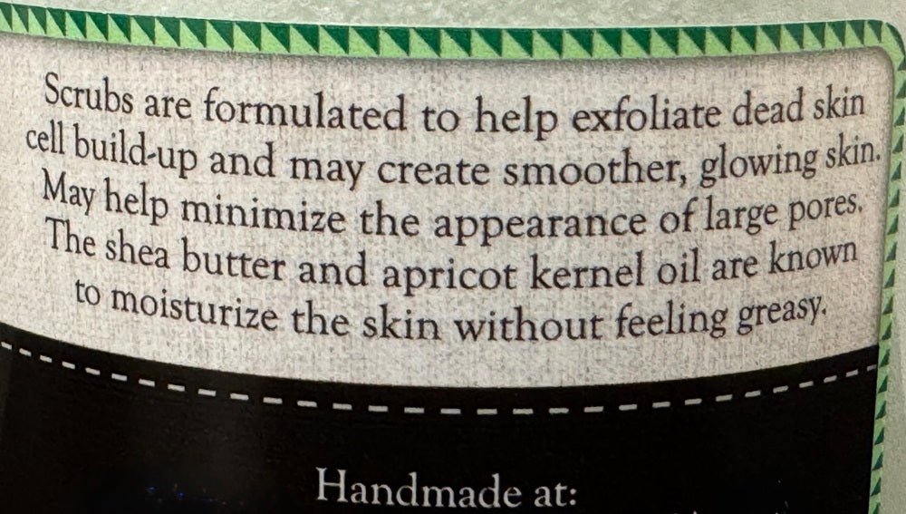 Raw sugar buffs away dry skin while rich oils leave you feeling soft, smooth, and seasonally pampered. Scrubs are formulated to help exfoliate dead skin cell build-up and may create smoother, glowing skin. May help minimize the appearance of large pores. The shea butter and apricot kernel oil are known to moisturize the skin without feeling greasy.