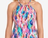 Playful and sophisticated, this Swim Solutions tankini features energetic waves of brilliant color and a high neckline accented with chic cutouts.