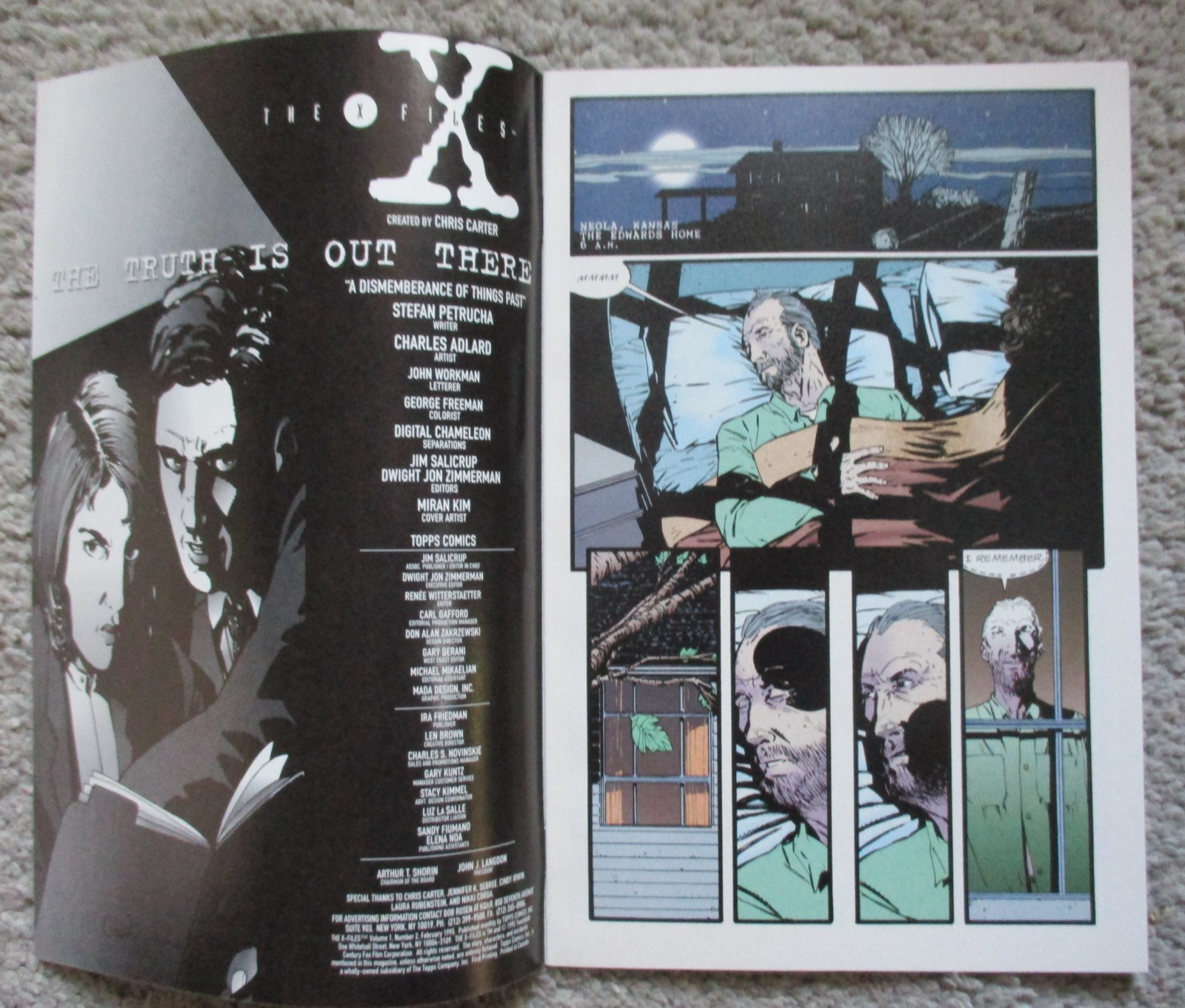 Painted cover by Miran Kim. "The Dismemberance of Things Past," script by Stefan Petrucha, art by Charles Adlard; Scully and Mulder discover that the alleged crash site of an extraterrestrial craft could be at the center of a government-sanctioned web of lies and violence as witnesses to the long-ago event are murdered when they start recalling the truth of what happened. 36 pgs., full color. Cover price $2.50.