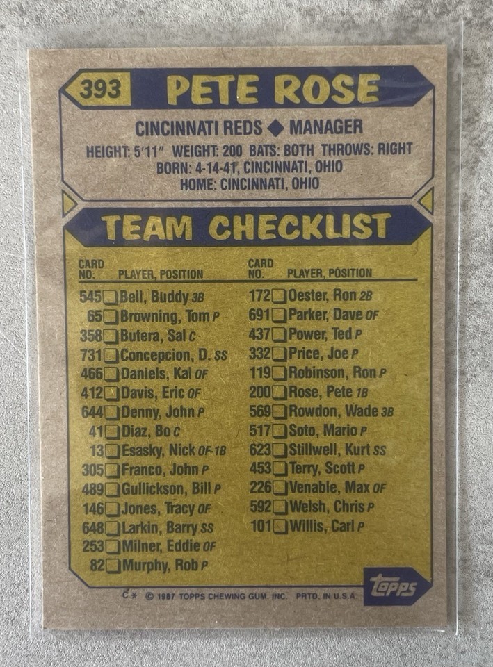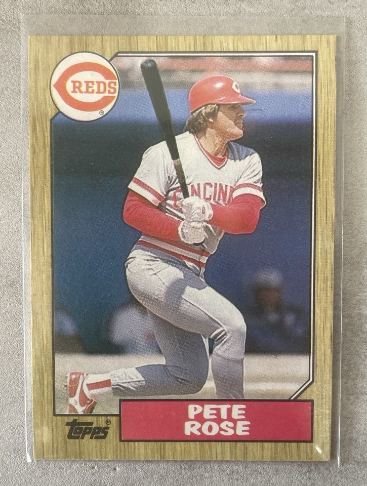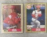 The product includes 2 vintage 1987 Topps Pete Rose baseball cards, featuring the Reds player and manager. These standard, original, non-autographed cards are collectible pieces of MLB history and iconic baseball memorabilia.