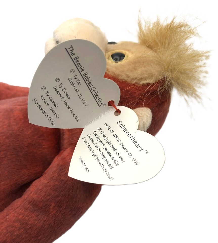 TY Beanie Baby Schweetheart the Orangutan 9 inch DOB 1/23/1999. Still has tush tag and heart tag attached.
