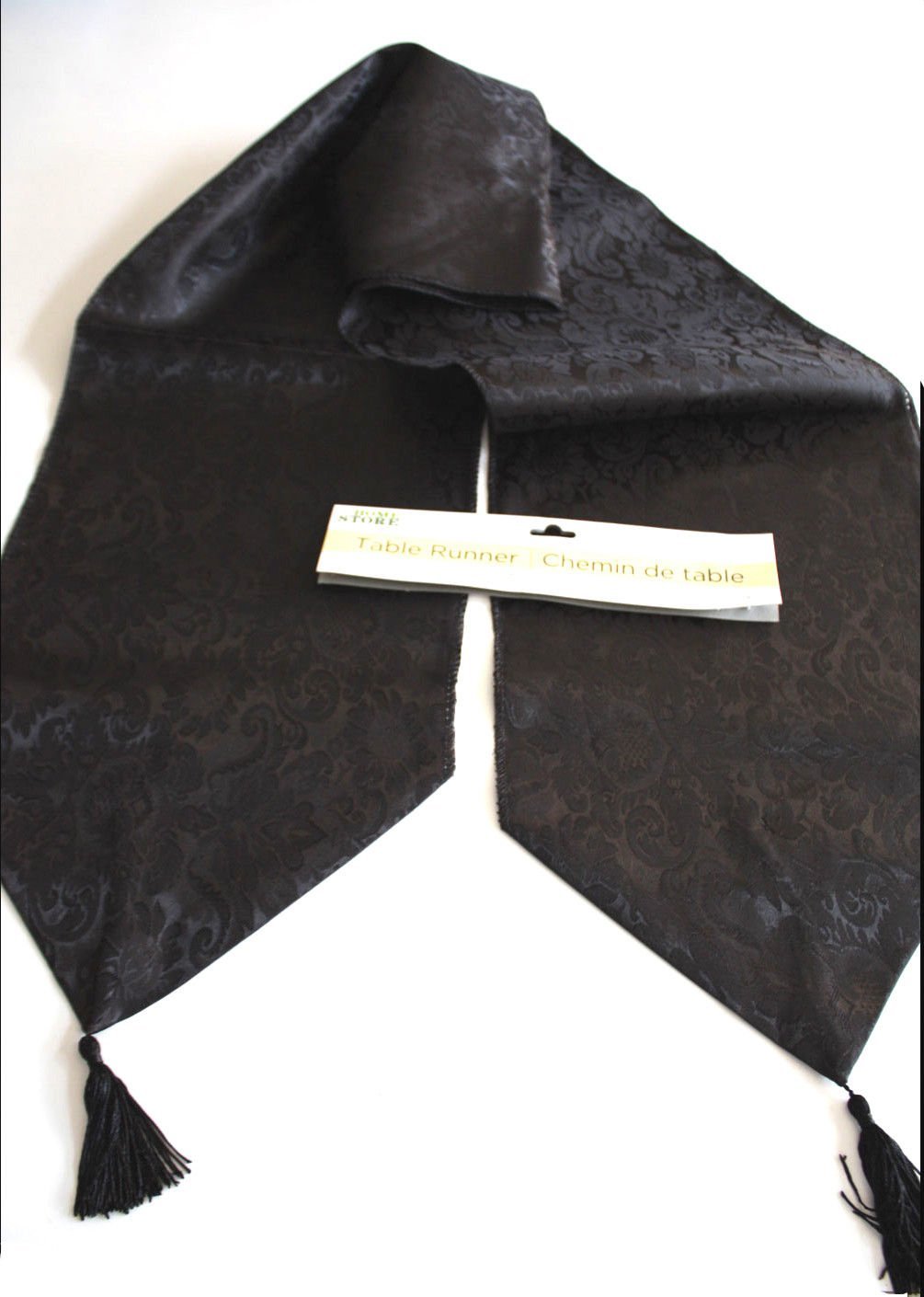 Product description: Elegant Gothic Damask BLACK TABLE RUNNER SWAG DRESSER SCARF Halloween Witch Vampire Castle Mansion Haunted House Mantel Cover Holiday Christmas Decoration-Six Feet Long 6-ft long x 12-inch wide