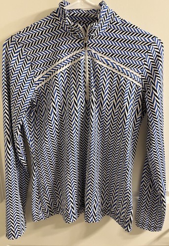 This Tail White Label women's shirt is perfect for any casual occasion. The mock neck and pullover closure make it easy to wear, while the 1/4 zip and long sleeves and the blue and black chevron pattern adds a stylish touch to the shirt. It's suitable for both winter and summer seasons, and is perfect for activities such as tennis and golf. Get your hands on this high-quality shirt today! Very good condition and comes from a smoke free home!