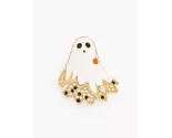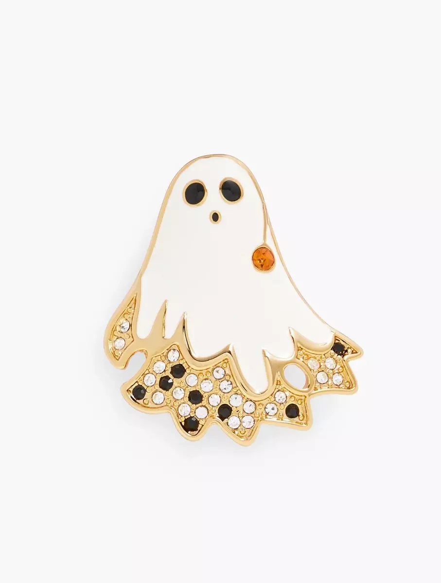 A boo-tiful pick for the season! A friendly ghost brooch sparkles with shimmery light-catching stones. A smile-worthy accent for your sweater or lapel.- Standard pin and catch closure - Fit: 1 2/5" x 1 3/5" - Material: 60% Zinc, 20% Enamel, 19% Glass Stone, 1% Cubic Zirconia - Color: Ivory/Gold - $49.50.