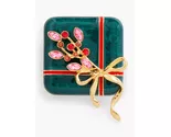 A playful gift box brooch. So fitting for the holiday season. Perfect for your favorite sweater.- Standard pin and catch closure - Fit: 17/8" - Material: 55% Zinc, 10% Brass, 15% Enamel, 15% Glass, 5% Cubic Zirconia - Color: Ruby Red/ Gold - $49.50.