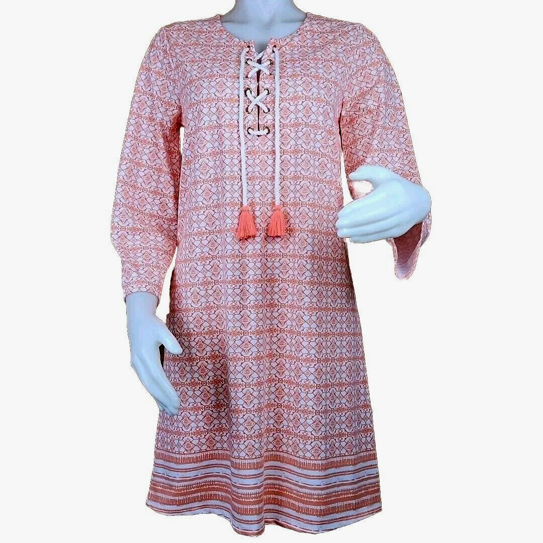 - Talbots Moroccan Print Dress Womens M Coral Cabana Life Shift Tassel Tie UPF 50