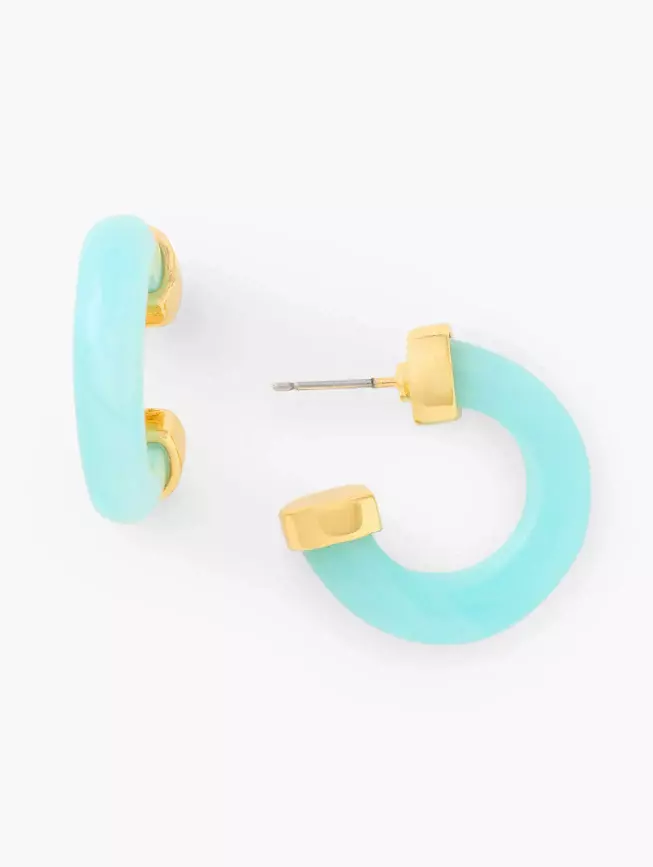 A perfect-for-everyday hoop earrings. Crafted from glossy enamel with gold details. Sweep your hair up to show them off.- Post - Fit: 1" x 1" - Material: 65% Resin, 35% Zinc Casting - Color: Blue Ice/Gold - $29.50.