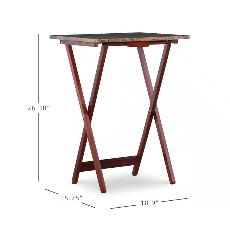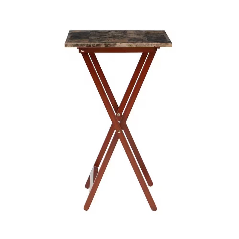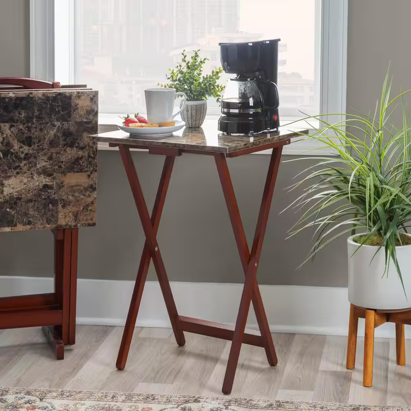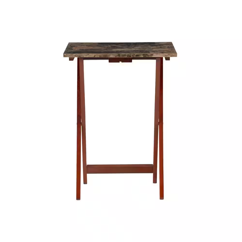 The Brown Faux Marble Rectangular TV Table Set has a distinctive look with its sturdy wood construction and faux brown marble top. This set includes foldable TV trays and one storage stand. The handle on the top of the stand makes it easy to transport the entire set from one room to another. A true home furnishings staple.