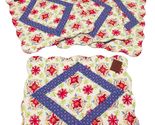 The vintage look pattern of these well made place mats will make a pretty addition to your table. Quilted, 100% cotton place mats are reversible. One side has red flowers scattered throughout the off white background. Some flowers bordered with a stencil like design of blue and pale gold. Other red flowers have a blue dot between the petals. The center of the place mat has a blue diamond shape accent that has small lighter blue daisy like flower with red centers. The place mats reverse to that same blue pattern. Mix it up and have 2 of each side for a fun look. Or, go traditional and use the same pattern for all 4 place mats