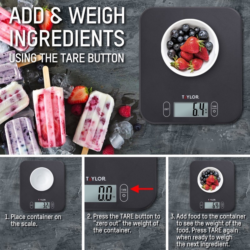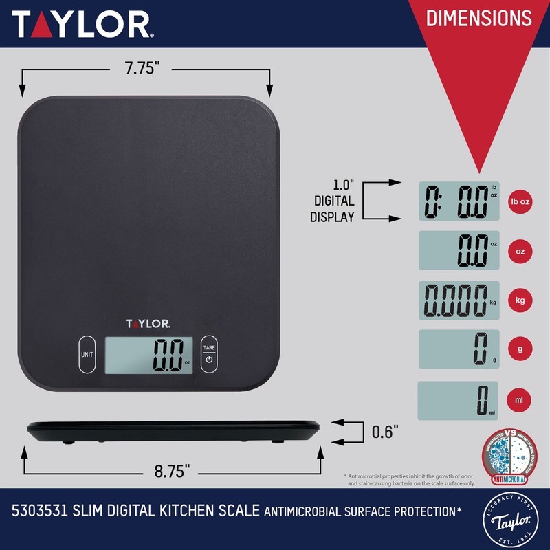 QUALITY AND PRECISION: Taylor has been making precision products for kitchen measurement for over 150 years, using only the highest quality components for accurate weighing. Measure precisely with an expanded capacity in both standard and metric units. INNOVATION: Sometimes during weighing the display might be covered by a bowl or plate - this scale has a HOLD feature that will "lock-inch in the last displayed weight so the product can be removed and the final weight can be read. VERSATILE DESIGN: This product includes touch control buttons that won't collect kitchen dust or food particles. EASY TO READ: The large LCD screen display is 1 inch for easy viewing BATTERIES INCLUDED: Two (2) AAA batteries. Install or remove insulation tab to activate scale before first use.