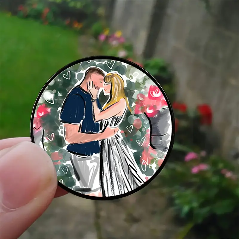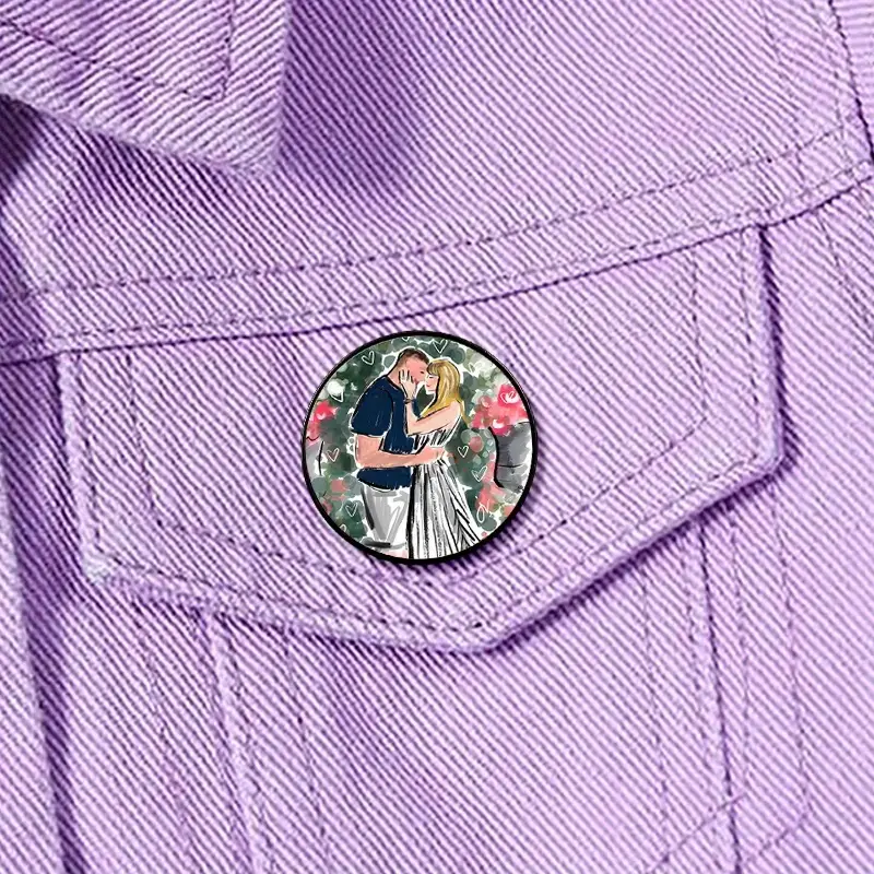 Celebrate the love story that's captured our hearts! This rare, fan-made enamel pin features a dreamy drawing of Taylor Swift and Travis Kelce in an iconic post-proposal embrace, surrounded by a lush garden of flowers. A sweet tribute to the moment our favorite English teacher and gym teacher finally made it official ??