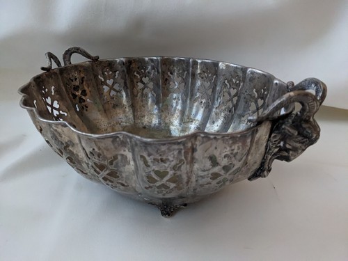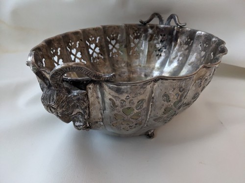 ¡Este tazon plateado con patas es una impresionante pieza de declaracion en cualquier hogar! Cuenta con un patron perforado y la cabeza de Ram maneja en un tazon grande, aproximadamente 17 "desde la cabeza de Ram hasta la cabeza de Ram x 11 1/2" x 6 "de altura. Hermoso patron en el centro inferior. Solicite cualquier otra informacion o imagen. ¡No soy fotografo y tengo problemas para obtener buenas fotos!