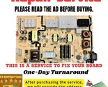 REBUILD SERVICE on your main board. You will have to send your part to us for repair. We will rebuild and mail the part back to you within 48 hours after receiving the part. We use USPS Priority Mail service which takes additional 2-3 business days for delivery. When you ship your board to us for repair, please let us know the tracking number from the receipt We don't repair burned boards, missing parts or If your board has been repaired or replaced parts . We have the same TV to test your board We will make sure your BOARD is in working condition and send back to you We have been in business for over 25 years to repair tv lcd dlp plasma. In most cases we can repair the defective board, however if your board can't be repaired, ( no repairing fee) ABOUT THE WARRANTY: UNLESS SPECIFIED OTHERWISE, ALL OF OUR PARTS ARE WARRANTIED FOR 30 DAYS. AGAINST REPEAT IDENTICAL FAILURE FROM THE DATE OF RETURN SHIPPING. THANKS FOR READING AND WE LOOK FORWARD TO DOING BUSINESS WITH YOU Track Page Views WithAuctiva's FREE Counter