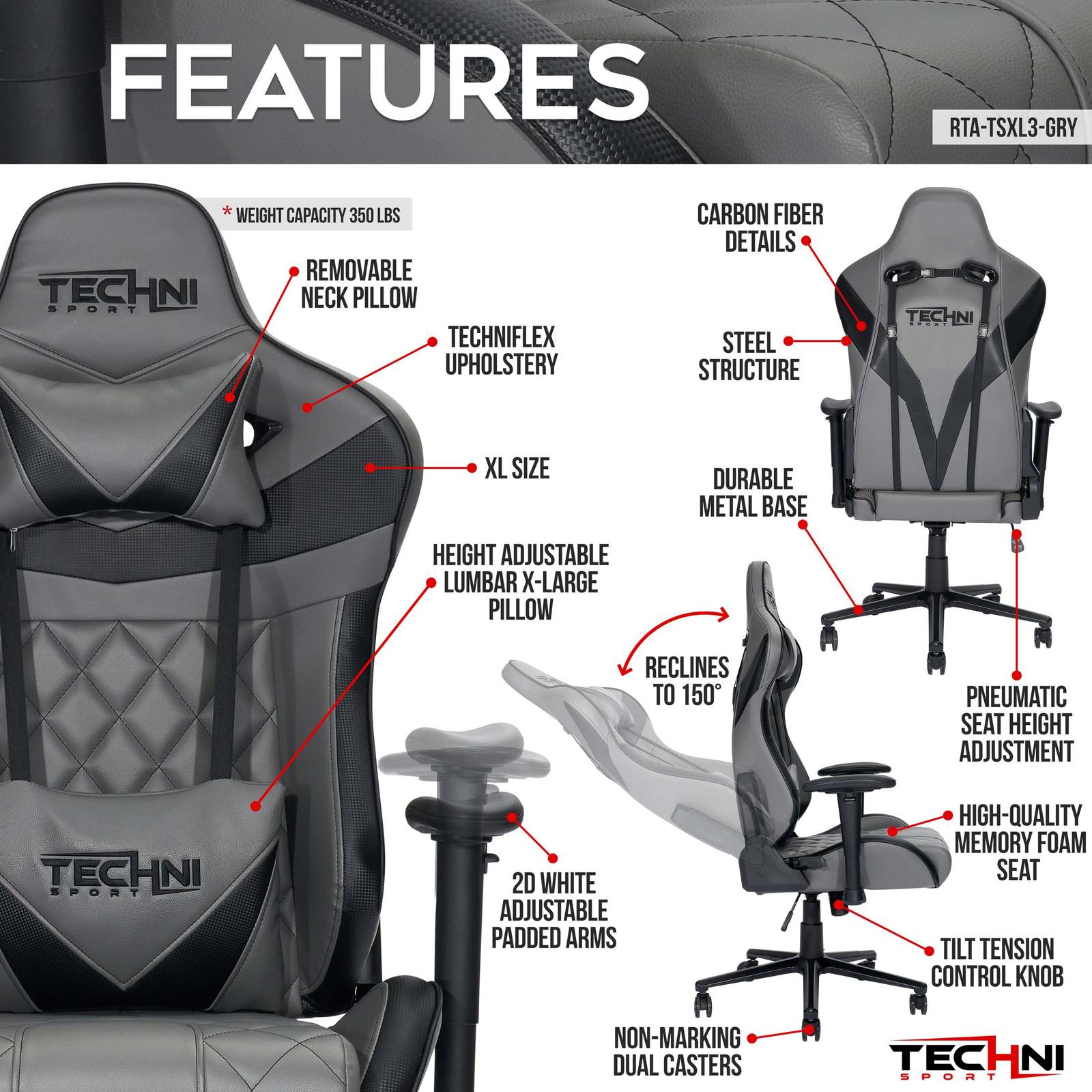 - Techni Sport XL Ergonomic Gaming Chair Grey | Premium Comfort
