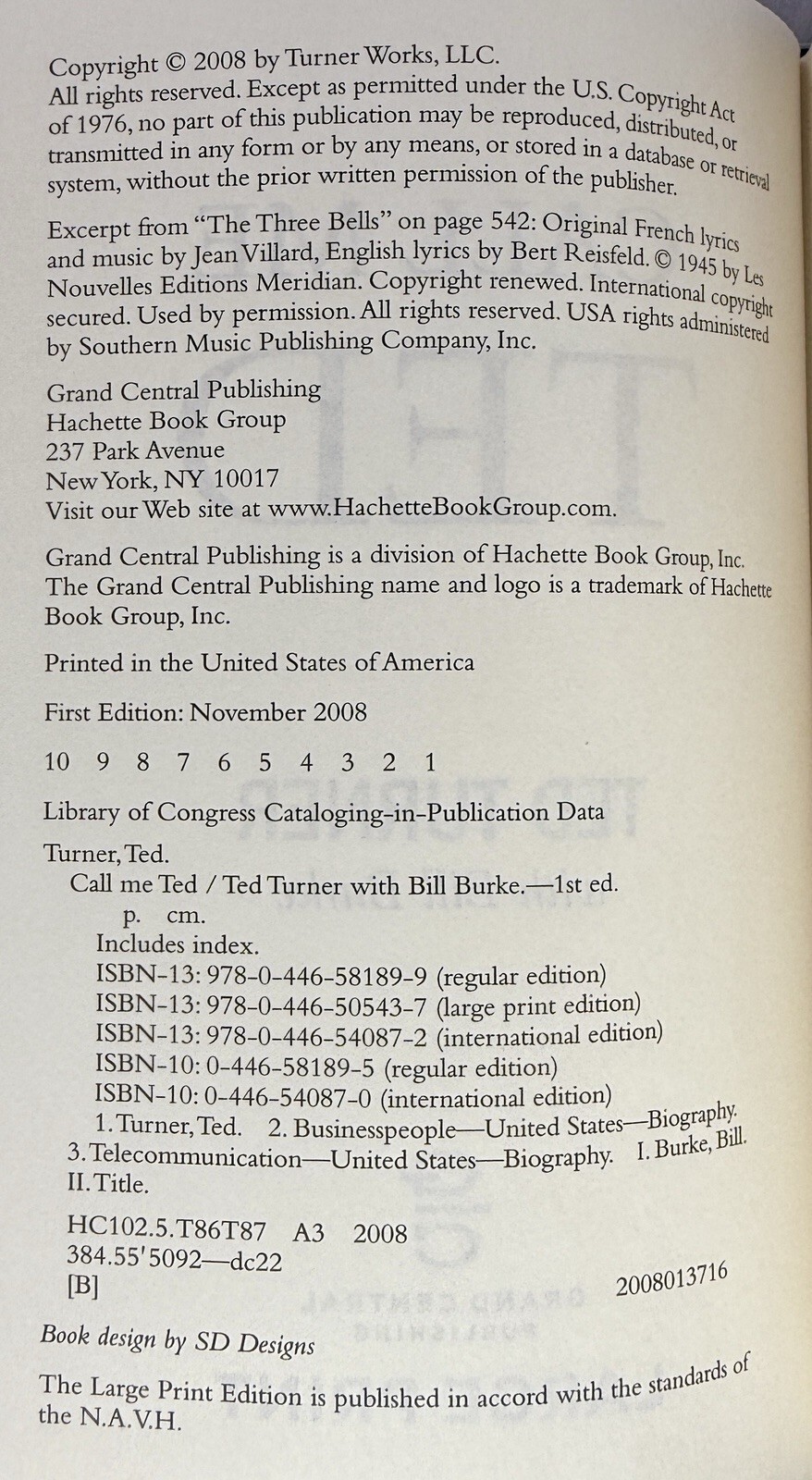 The product is a hardcover large print book titled "Call Me Ted: My Life, My Way" by Ted Turner and Bill Burke. Published by Grand Central Publishing in 2008, this biography covers the life and business of Ted Turner, focusing on topics related to his career in media and entertainment. The book features illustrations and has a total of 448 pages, making it a comprehensive read for those interested in the life of this influential figure in the industry.