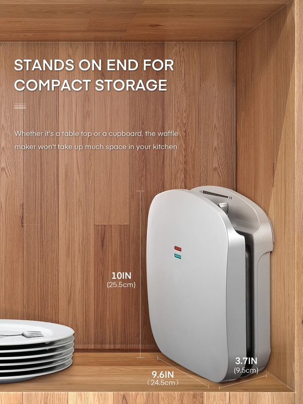 The green indicator light lets you know that your waffle maker has been preheated. Simply pour the batter, close the lid, and move the knob to adjust the temperature. Closer to the MAX, the crisper and more golden the waffle will be. When the green indicator lights up again, you know that the delicious waffles have finished baking. The waffles have extra-deep pockets for your favorite ingredients. Due to its non-stick cooking surface, the FOHERE waffle maker is also easy to clean. Although it makes two waffles at a time, it reheats and cooks quickly, so you can easily make one waffle after another.