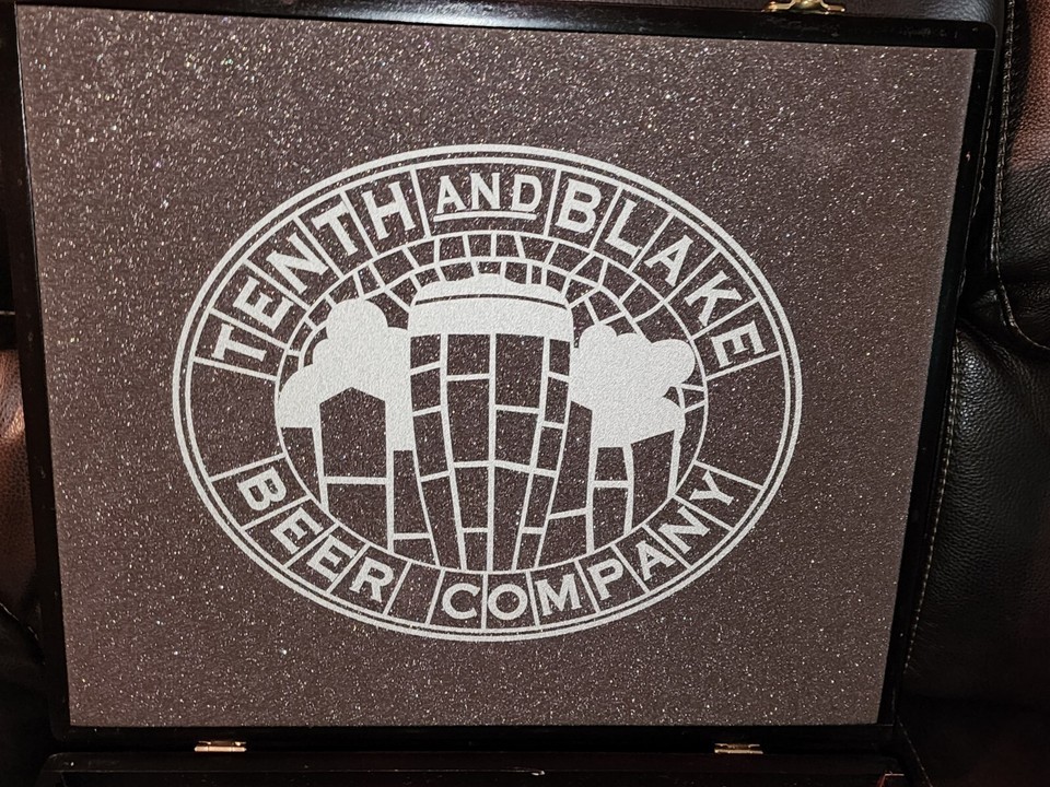 - Tenth and Blake Beer Company Logo Wood Boxed Beer Tasting 8 Glasses Rare Set