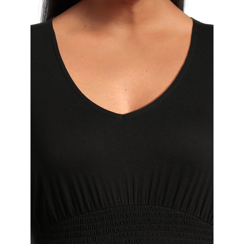 Make a stylish statement in this feminine flowy, effortless style mini dress by Terra Sky. The wider smocked band defines the waist, with beautiful shirring details below it. Finished in fluid jersey, this V neck sleeve
