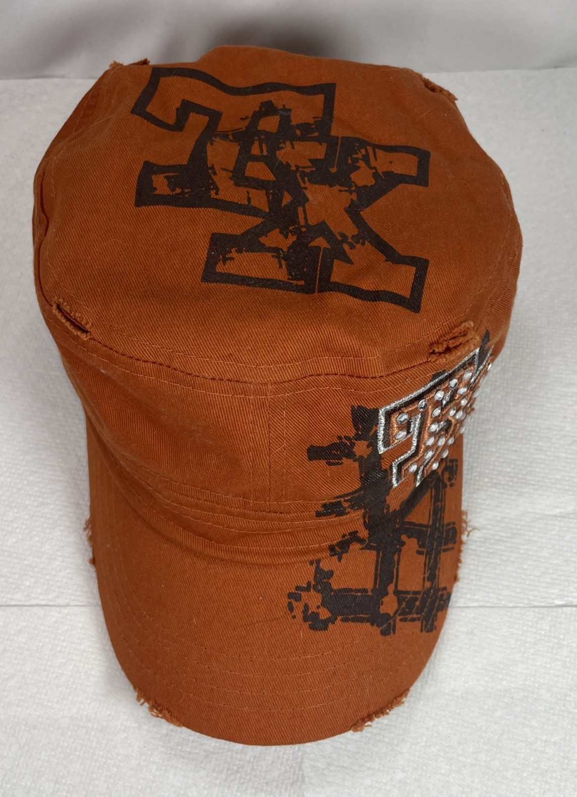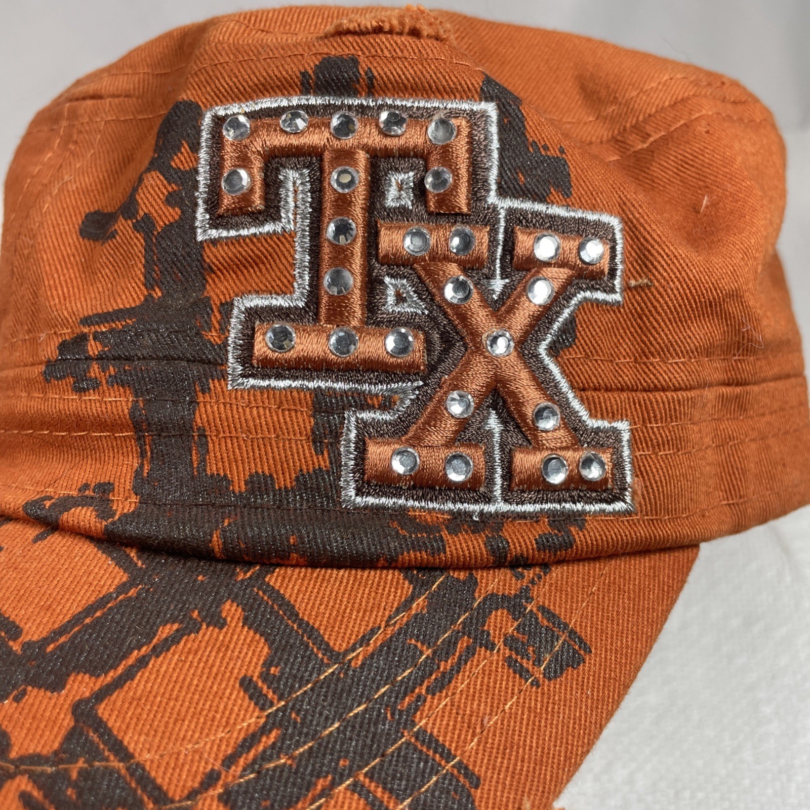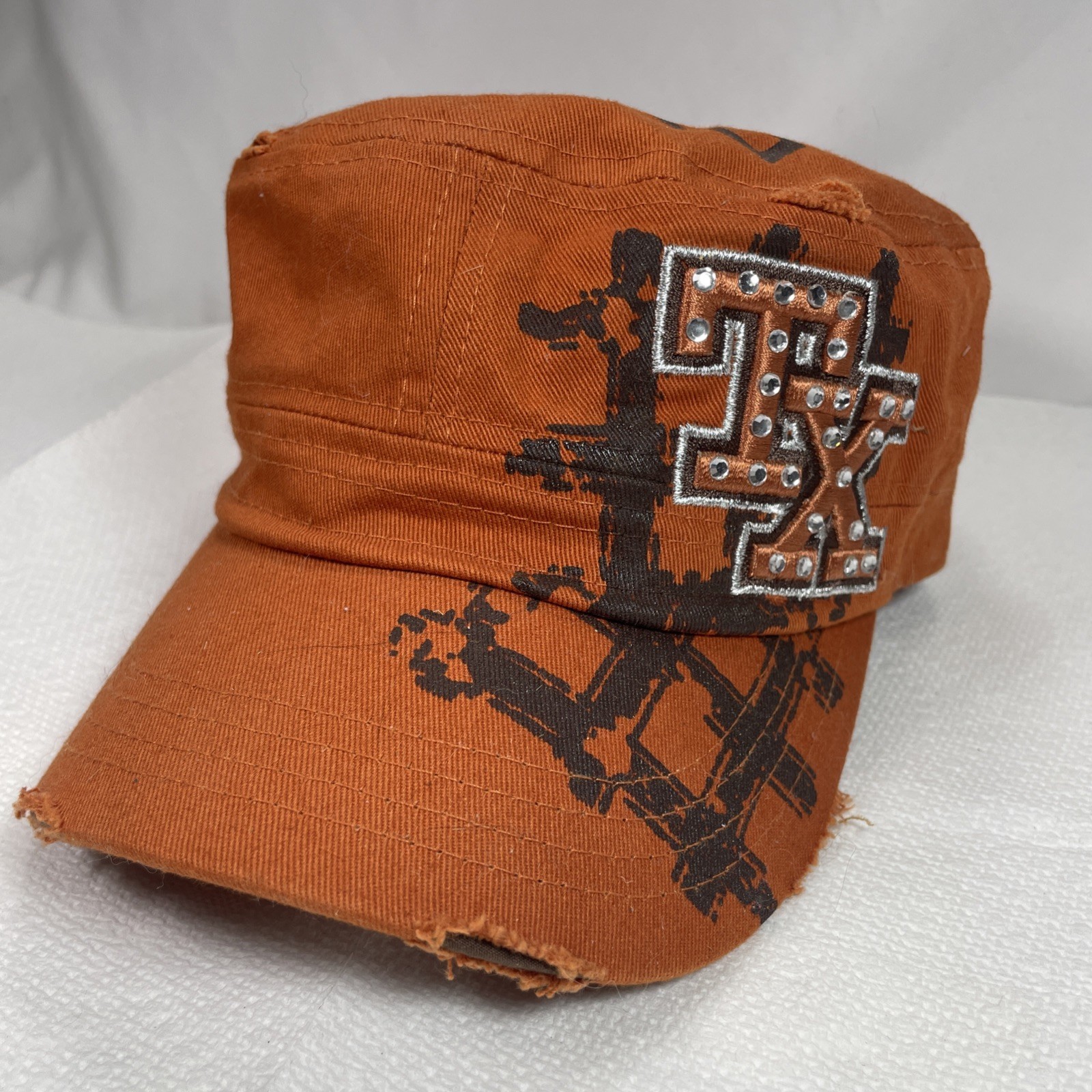 The Texas Women's Cap is a stylish army cap featuring a distressed rhinestone bling graphic with an embroidered TX design. Made from 100% cotton canvas in a solid orange color, this adjustable cap is perfect for women looking to add a touch of Texas pride to their wardrobe. The rhinestone accents and embroidered details give this cap a unique and eye-catching look, making it a fashionable accessory for any casual outfit. Made by the brand Rhinestone, this cap is a perfect choice for women who love a bold statement piece.