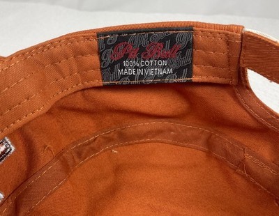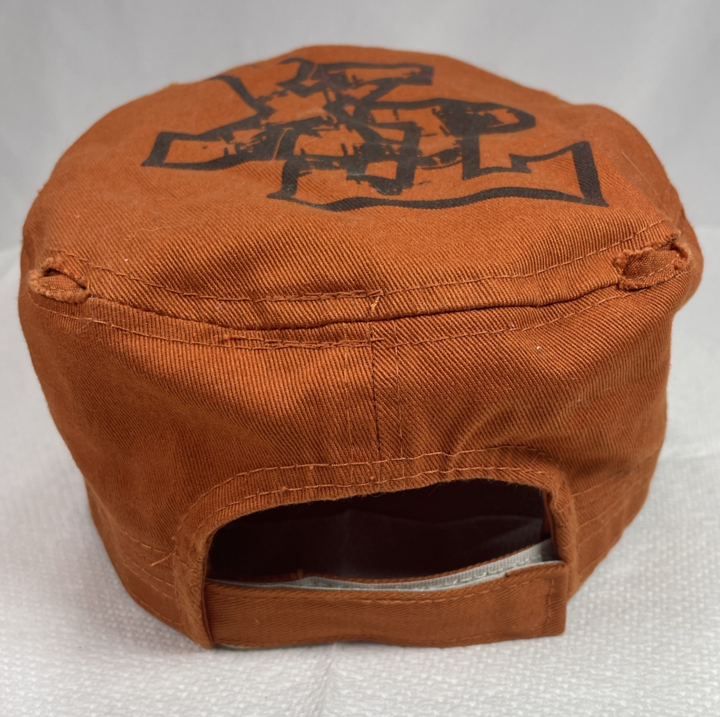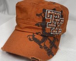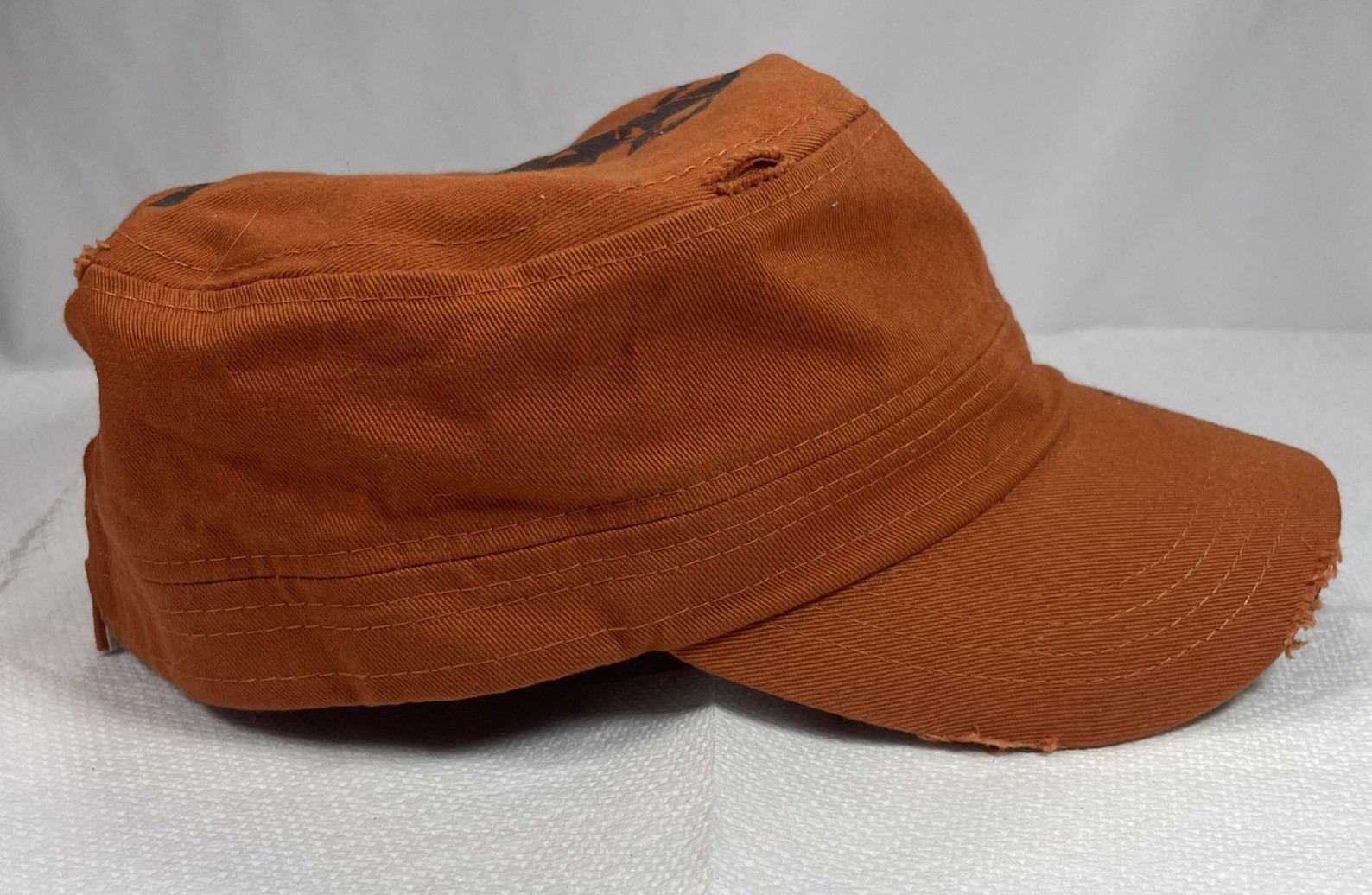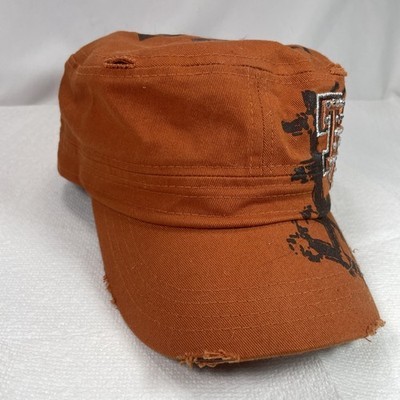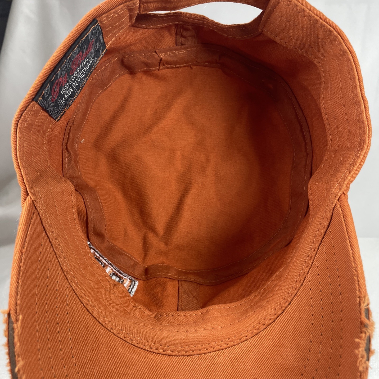 The Texas Women's Cap is a stylish army cap featuring a distressed rhinestone bling graphic with an embroidered TX design. Made from 100% cotton canvas in a solid orange color, this adjustable cap is perfect for women looking to add a touch of Texas pride to their wardrobe. The rhinestone accents and embroidered details give this cap a unique and eye-catching look, making it a fashionable accessory for any casual outfit. Made by the brand Rhinestone, this cap is a perfect choice for women who love a bold statement piece.