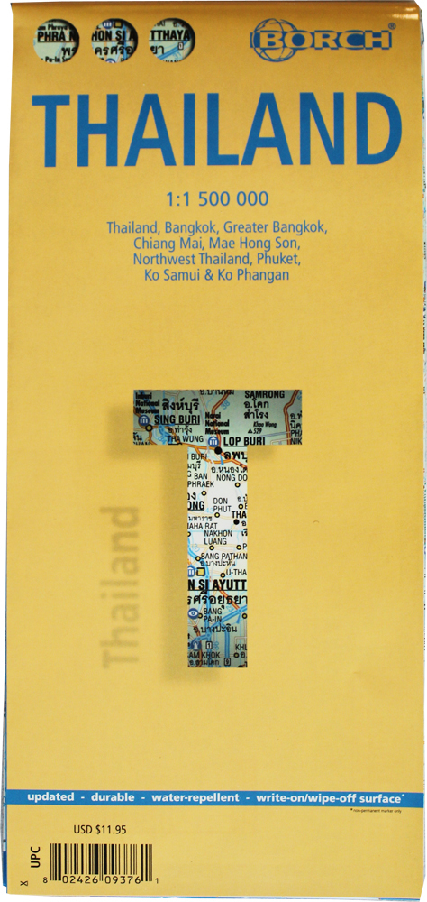 Our folded roadand travel map of Thailanincludes topsights,monuments, religious sites, point of interests,beaches, camping sites. The map distinguishes roads ranging from expressways/motorways to country lanes/paths. Climate charts show the average daily temperatures, humidity, hours of sunshine and precipitation for each month.These Borch mapsare durable, water-repellent and feature a laminated write-on/wipe off surface and measureapproximately 9.5"x4.5" when folded up and unfolds into a flat double-sided map measuring 34"x19.25".