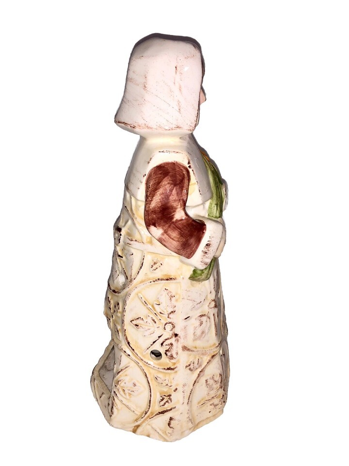 This is a set of Thanksgiving Pilgrim couple candle/tea light holders in a multicolor ceramic material. The man measures 12 inches tall, while the lady holder is 11 inches tall. The design is perfect for adding a festive touch to your Thanksgiving decor.