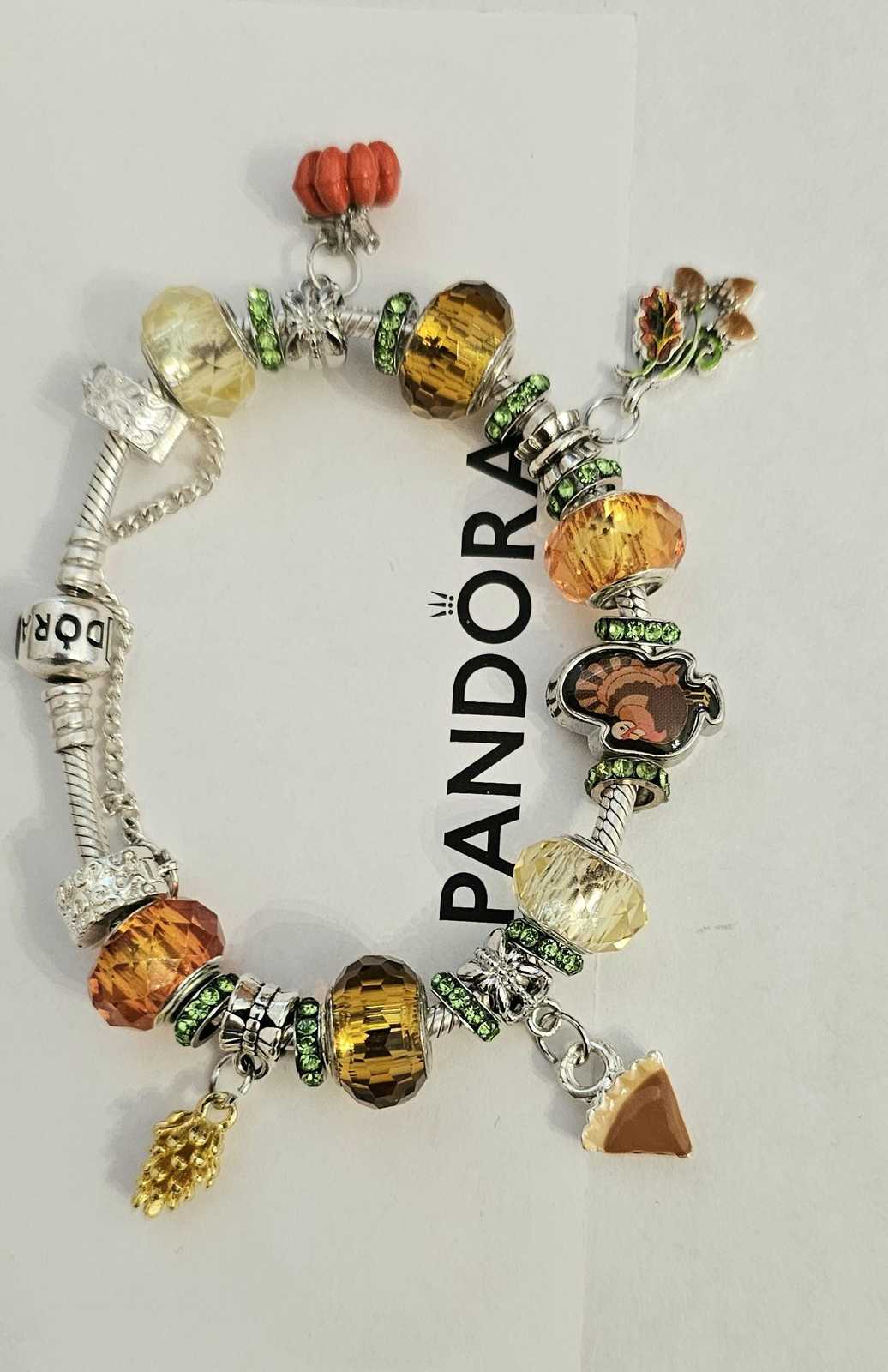 beads and charms include: Orange, Brown, Yellow single core diamond faceted beads, Gold Plated Pinecorn bead, slice of pie charm, Turkey Bead, Leaf/Acorn charm, silver plated Pumpkin charm