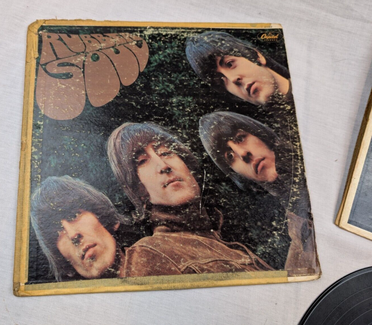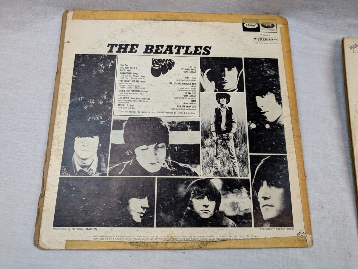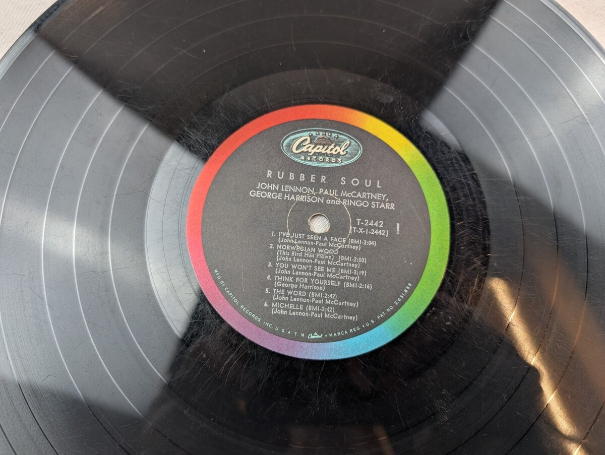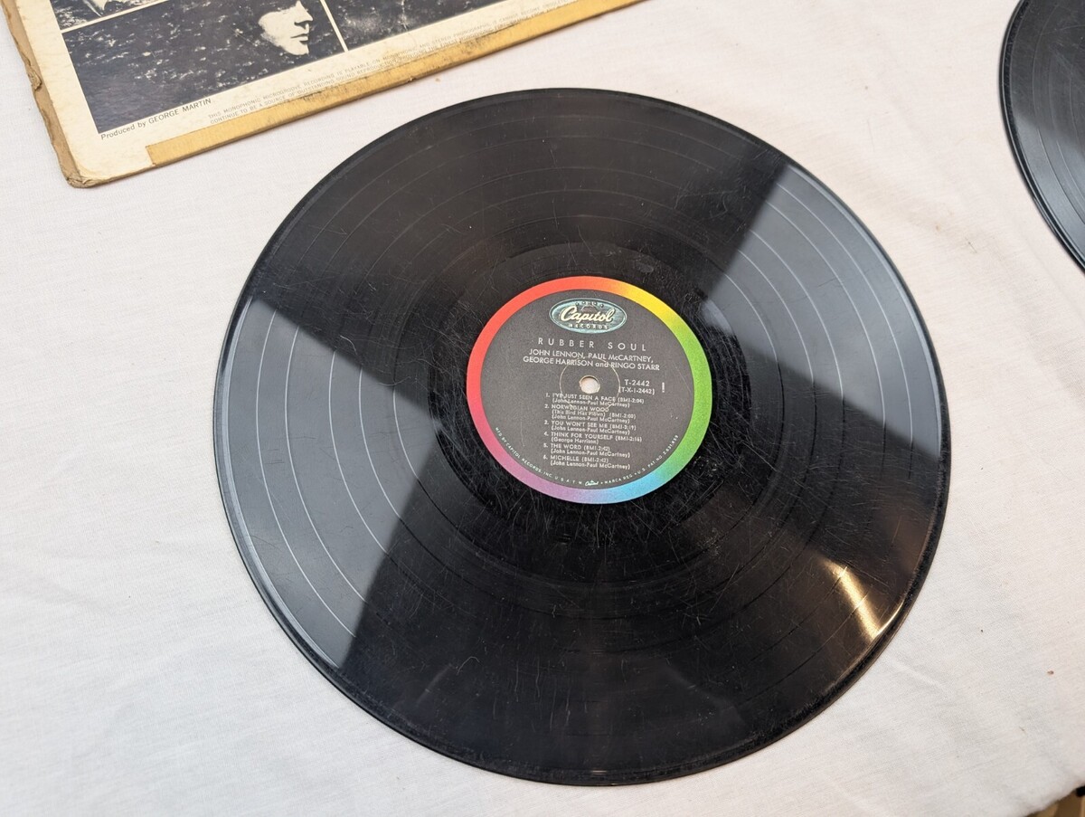 Rubber Soul (Capitol T-2442 Mono): Cover in fair condition with 3 edges taped and lots of shelf wear. Record is good condition. There are some pops in the quiets part but there were no skips. No inner sleeve