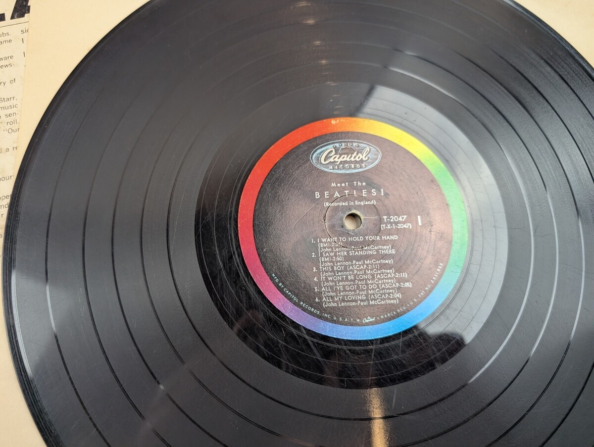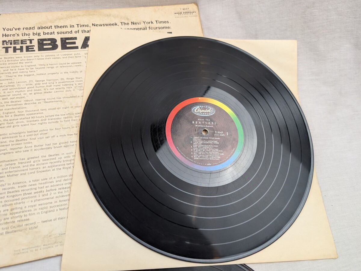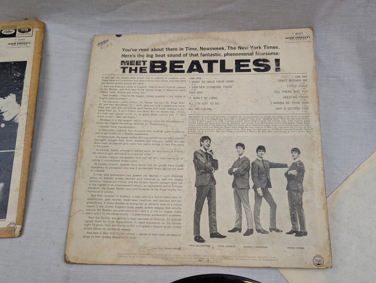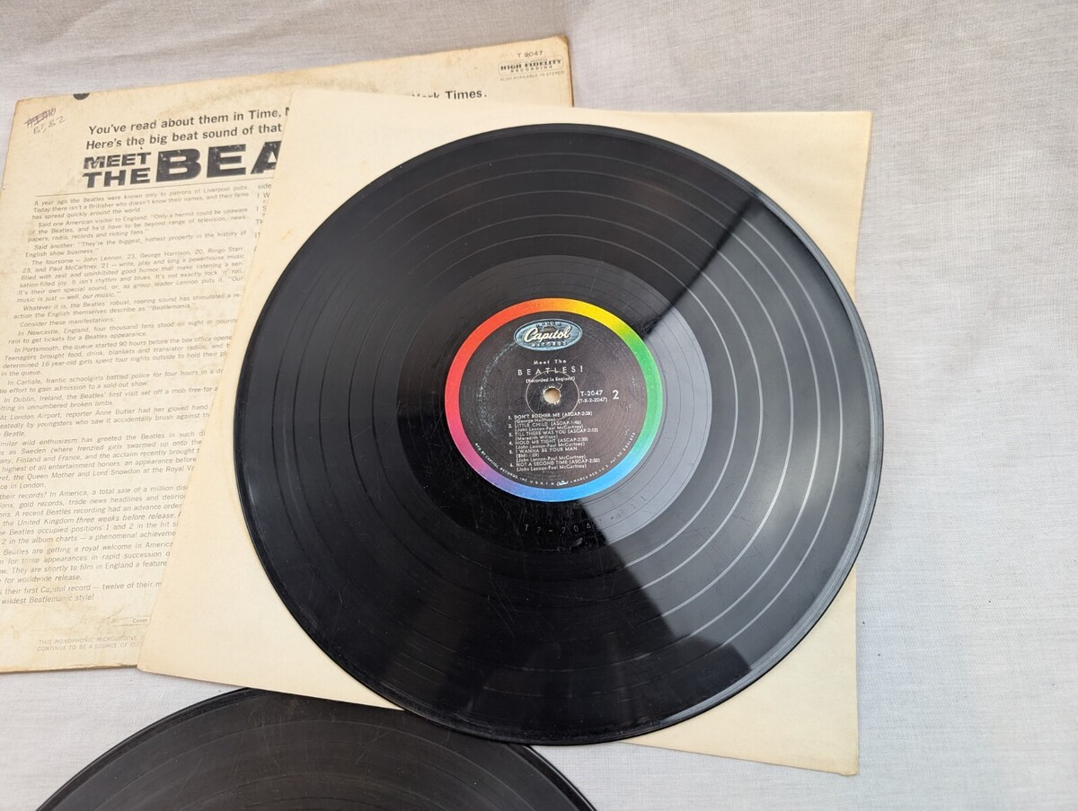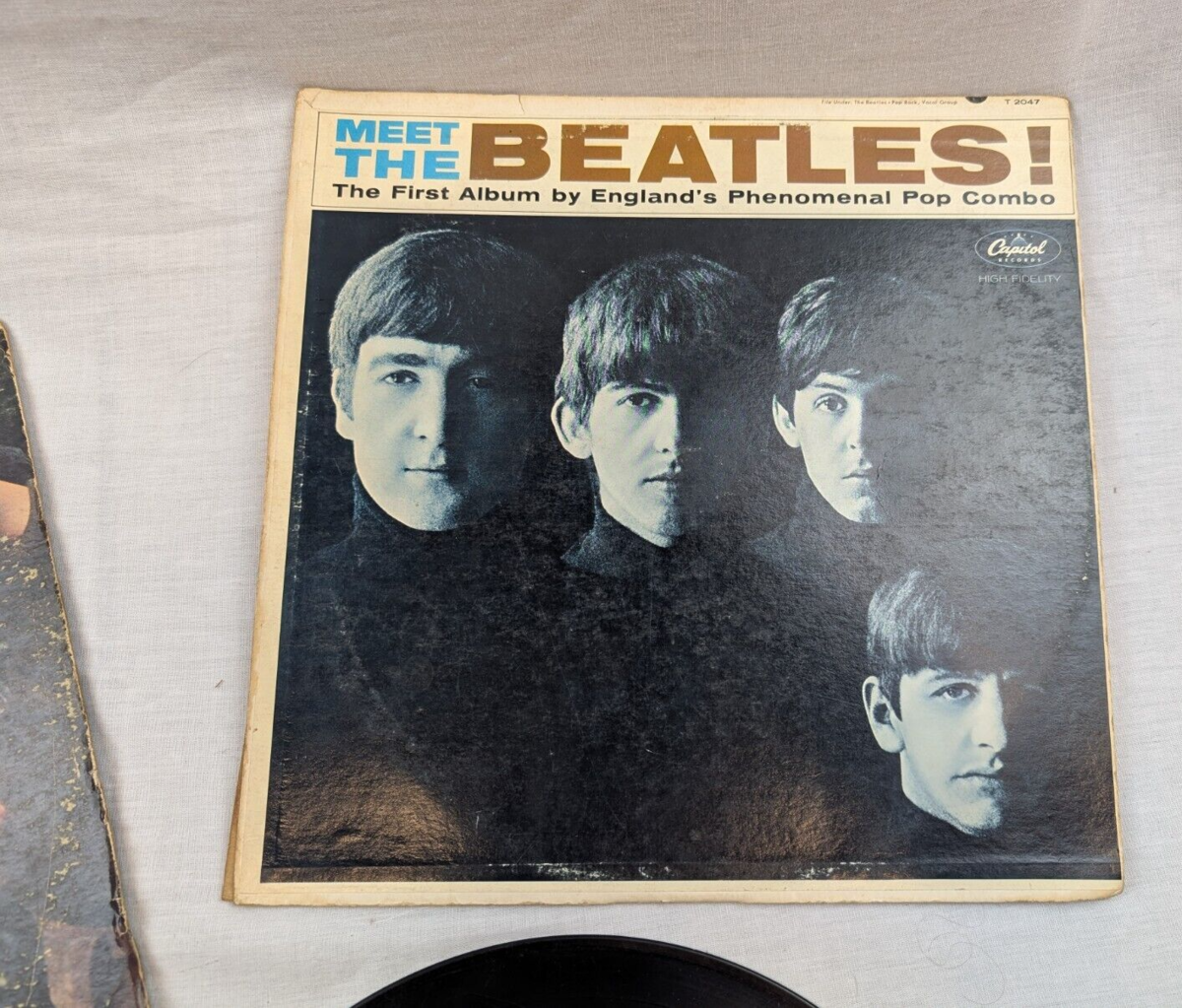 Meet The Beatles (Capitol T-2407 Mono): Cover is fully split on one side and mostly split on the bottom. Vinyl is in Good condition. There are a few pops in the quiet parts but no skips