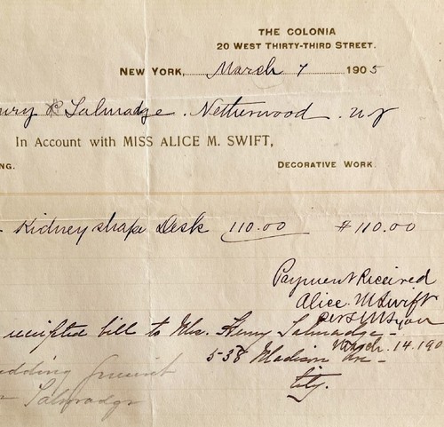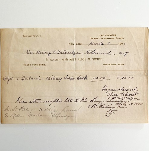 The Colonia House Furnishing Kidney Shape Desk Receipt Invoice 1905 DWP4B