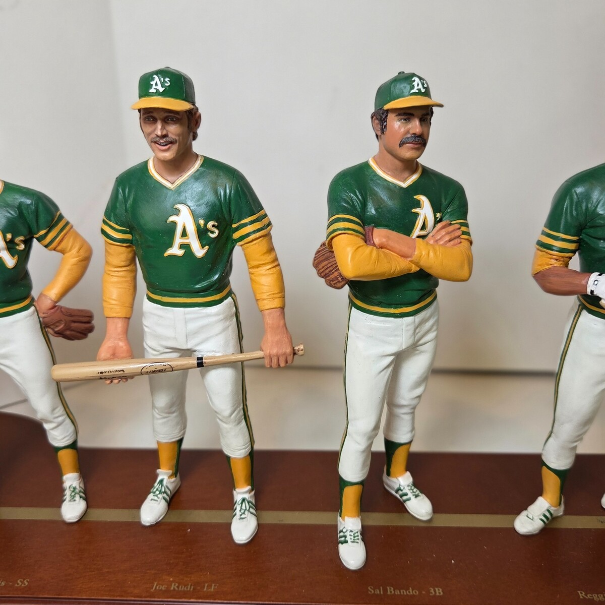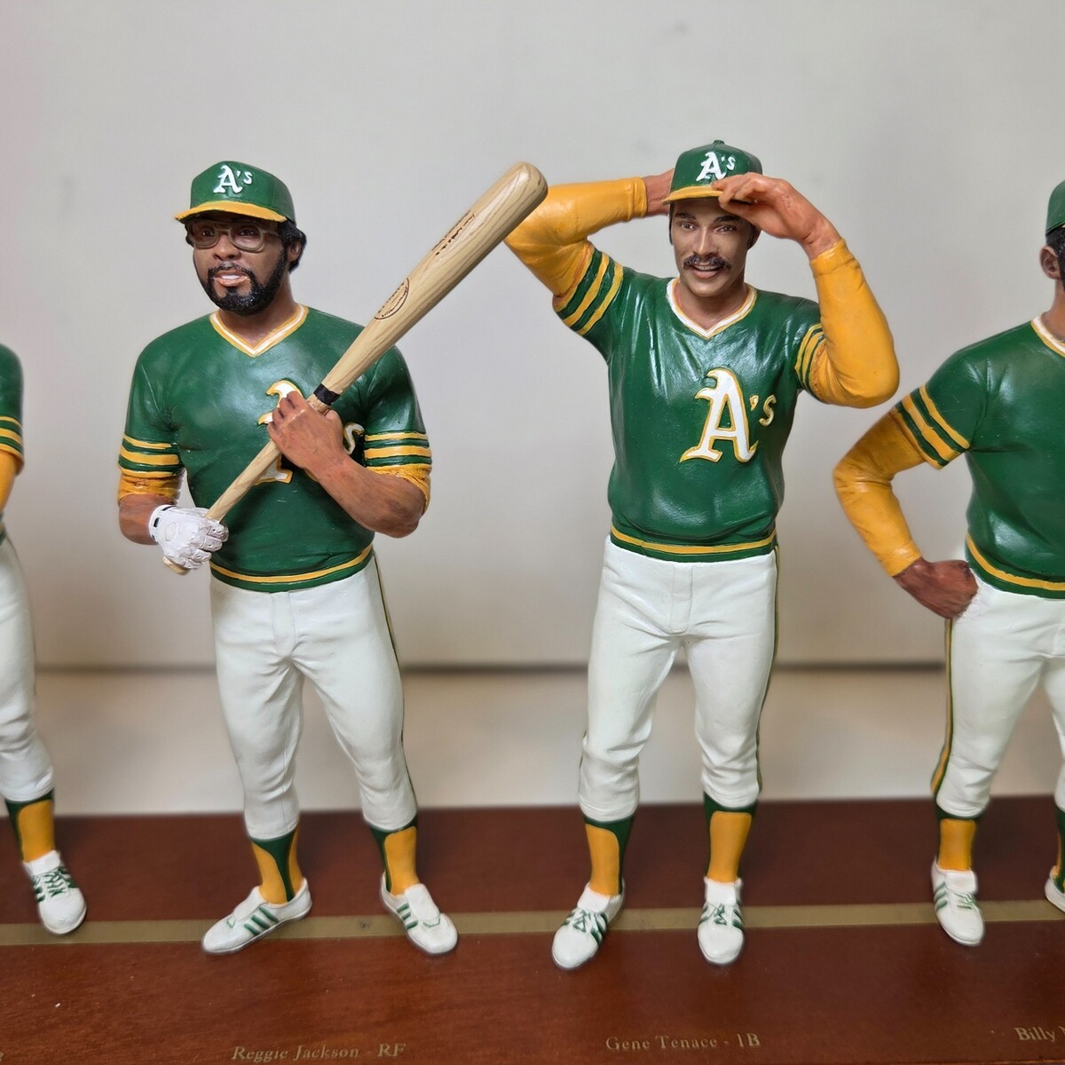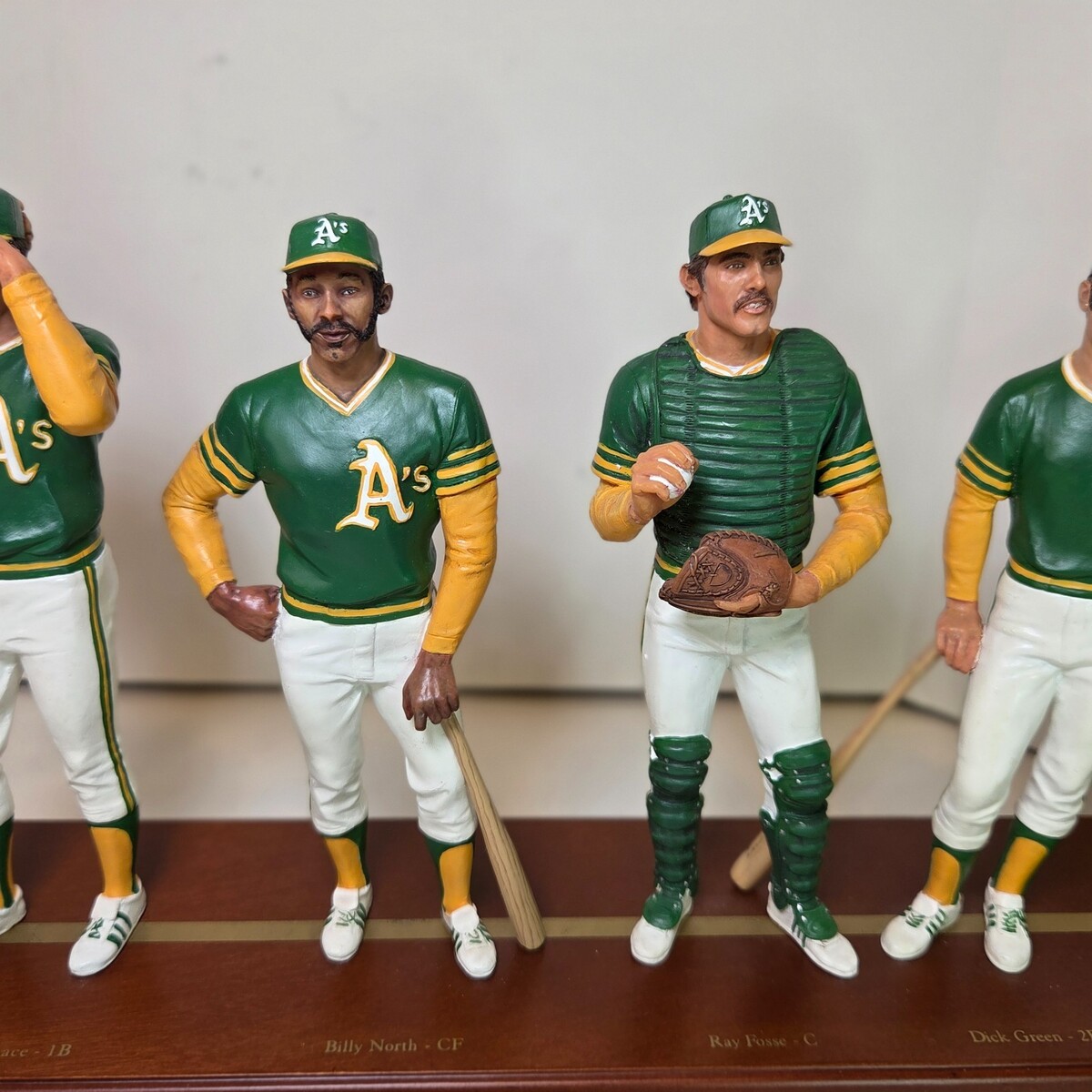 This hand-painted resin figure set features 10 detailed players, each wearing the A's signature green and gold uniforms, mounted on a polished wood base with brass nameplates. Notable figures include Reggie Jackson, Rollie Fingers, Catfish Hunter, Gene Tenace, and more.