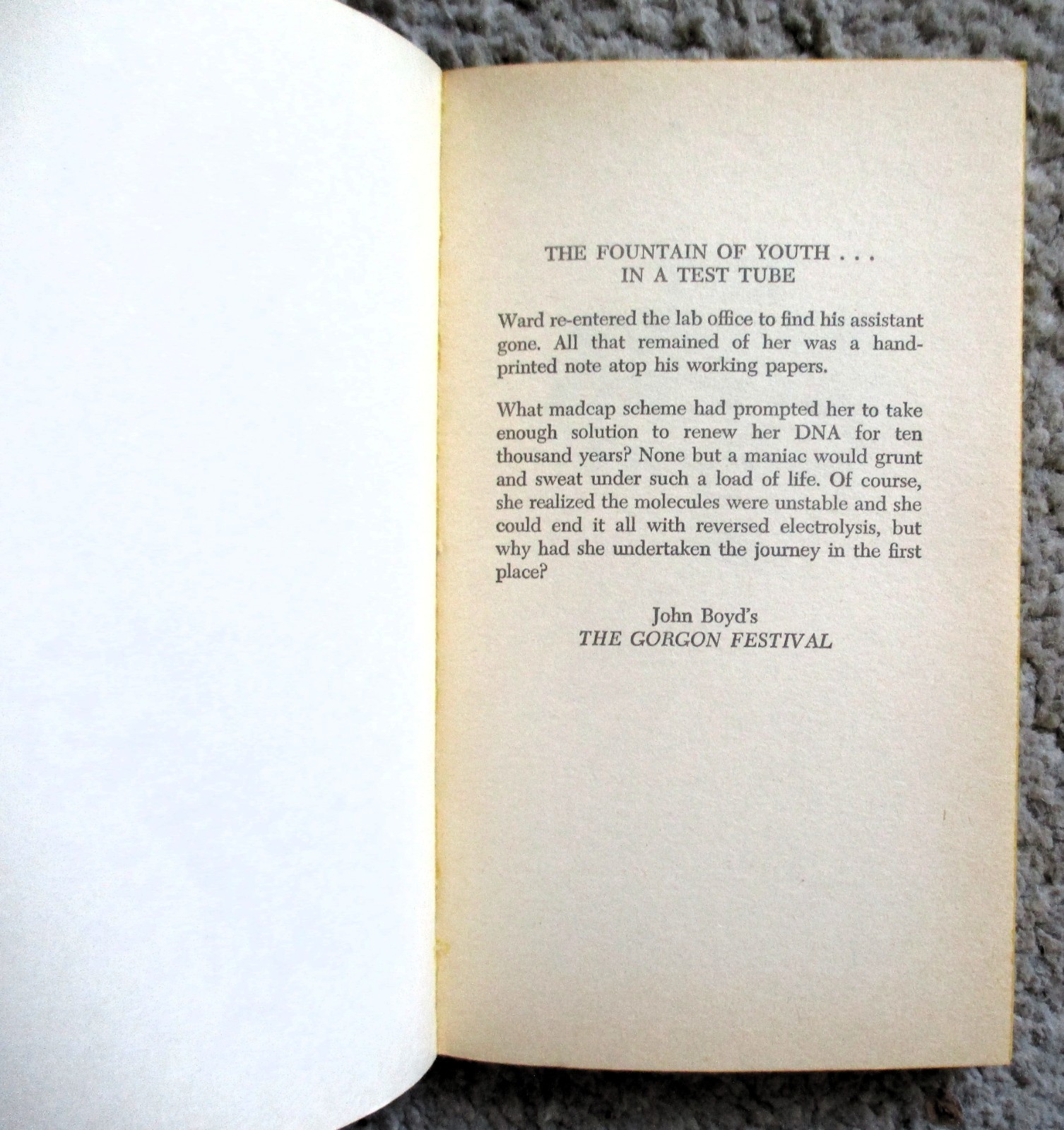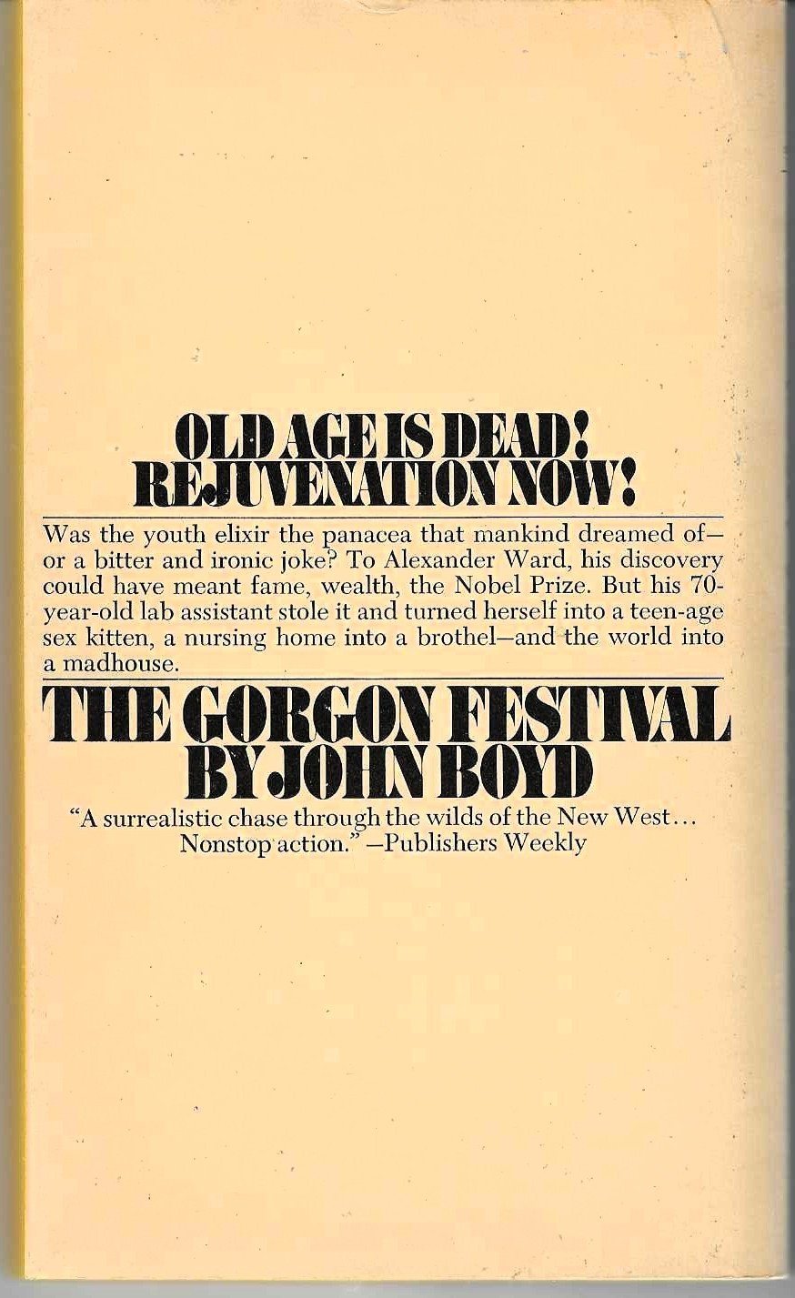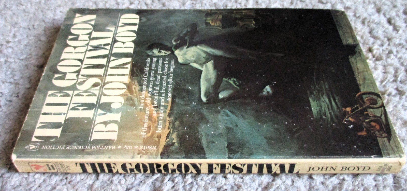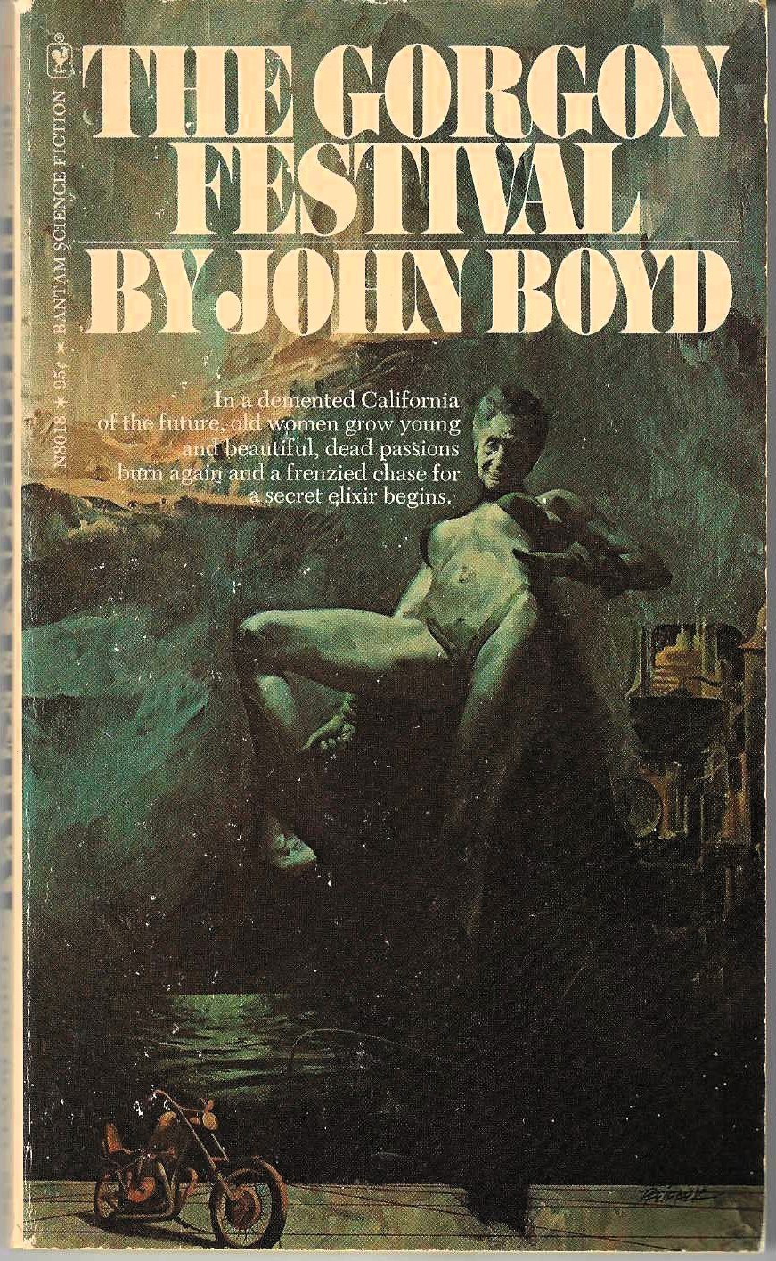 Vintage 186 page mass market paperback titled THE GORGON FESTIVAL by John Boyd/ Bantam Books No. N8018, ISBN # 0-553-08018-0, First Printing, January 1977/ Was the youth elixir the panacea that mankind dreamed of--or a bitter and ironic joke? To Alexander Ward, his discovery could have meant fame, wealth, the Nobel Prize. But his 70-year-old lab assistant stole it and turned herself into a teen-age sex kitten, a nursing home into a brothel--and the world into a madhouse.