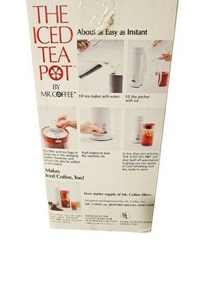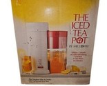 The Iced Tea Pot by Mr. Coffee Model TM1 in red is a vintage 1989 appliance designed to make tea. This iced tea maker can brew up to 12 cups of tea in just 10 minutes, with a 2 qt capacity. Made of lightweight plastic, it features a wall plug-in power source and comes with everything pictured. With its manual operation and classic design, this Mr. Coffee iced tea pot is a stylish addition to any kitchen for those who enjoy a quick and easy way to make delicious iced tea.