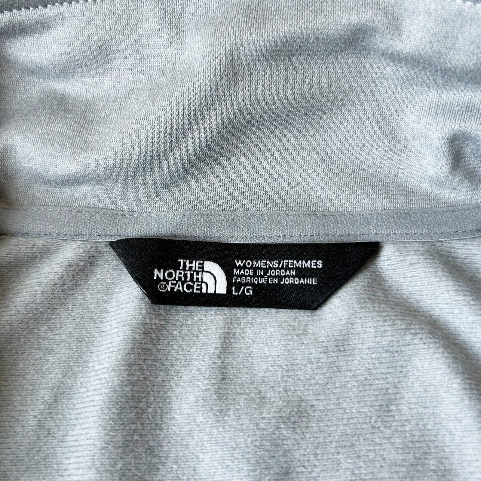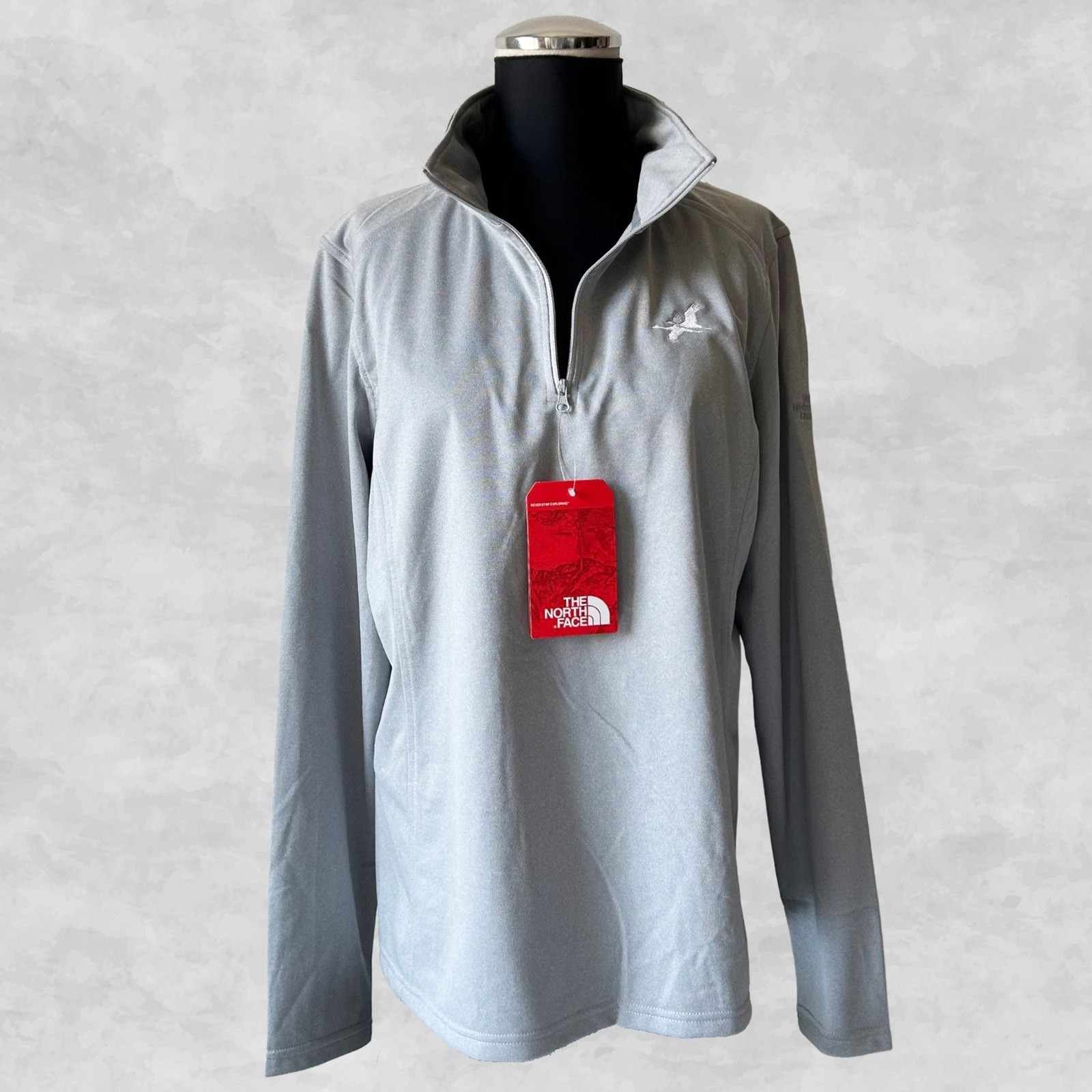 The North Face Tech 1/4 Fleece women's size Large top is NEW with tags. Light grey fleece pullover with 1/4 zip front and long sleeves. White embroidered ducks on left chest. Slim fit, 100% polyester.
