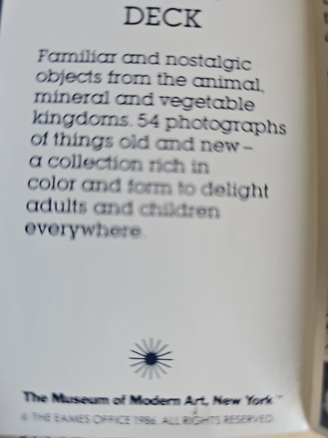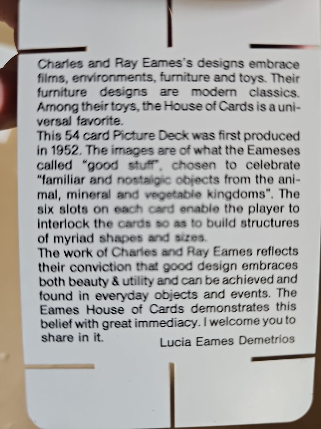 1952 deck (replica of not the original ofrriginal) by Charles Eames issued out of Museum of Modern Art NYC. Make your own sculpture of art cards.